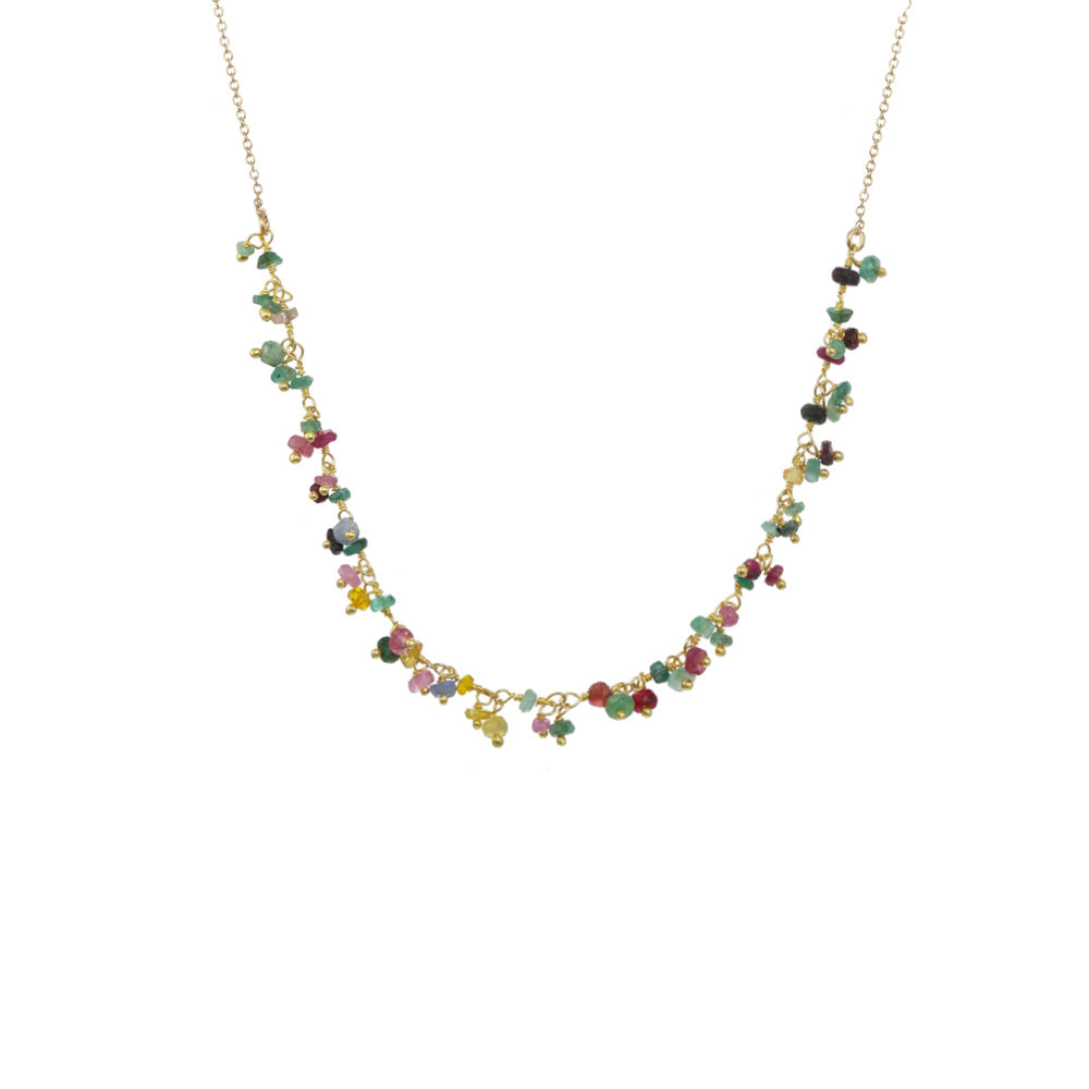 This Gemstone Dangle on Chain Necklace by Catherine Weitzman dances with vibrant hues and polished refinement. Featuring a trio of semi-precious multi sapphire stones on a delicate gold-fill chain, it channels tropical elegance with effortless flair. Handmade in Hawaii.