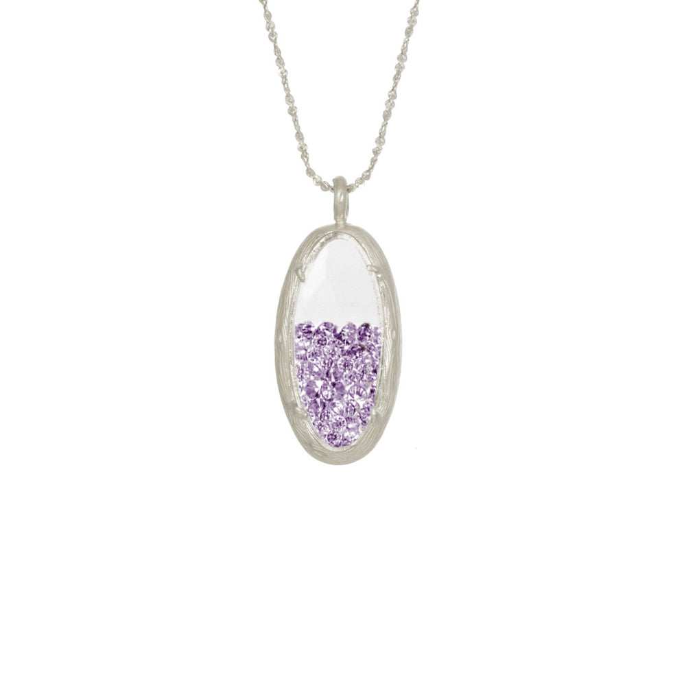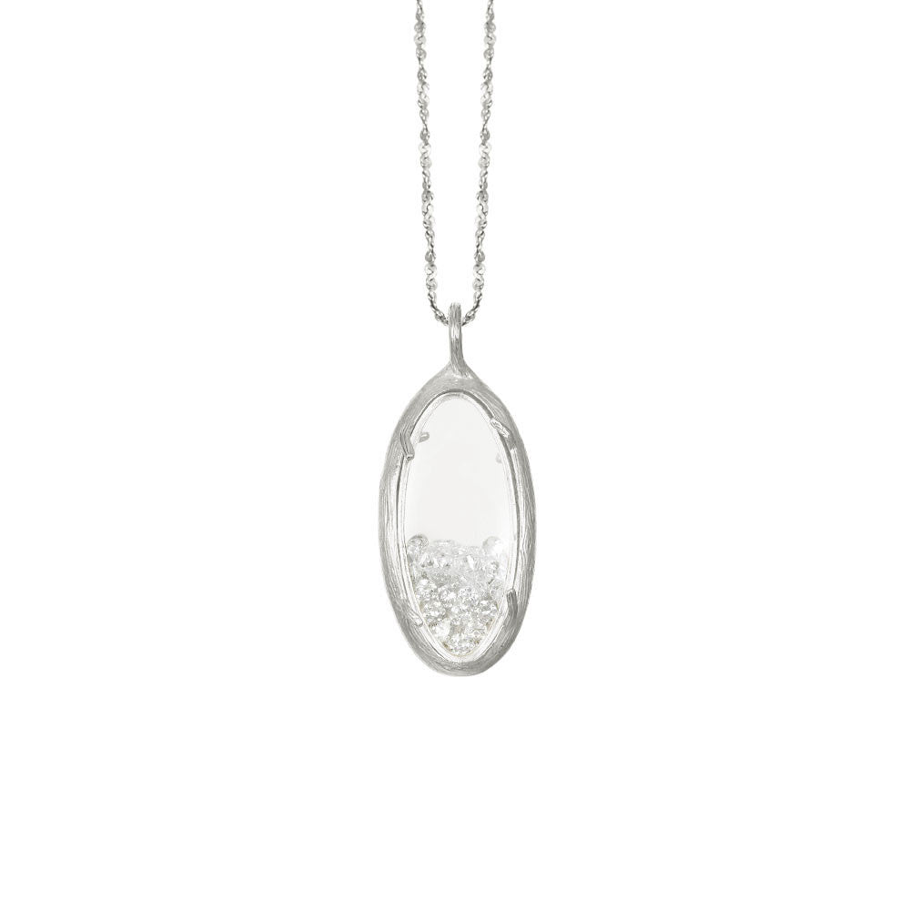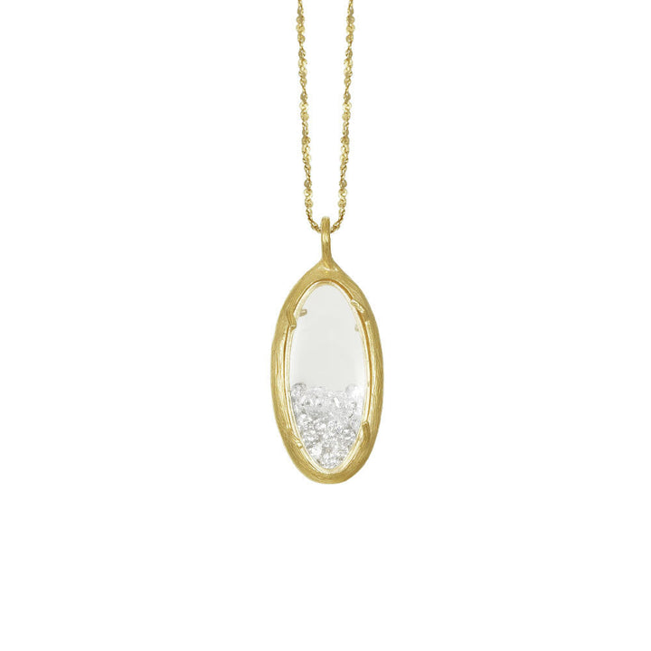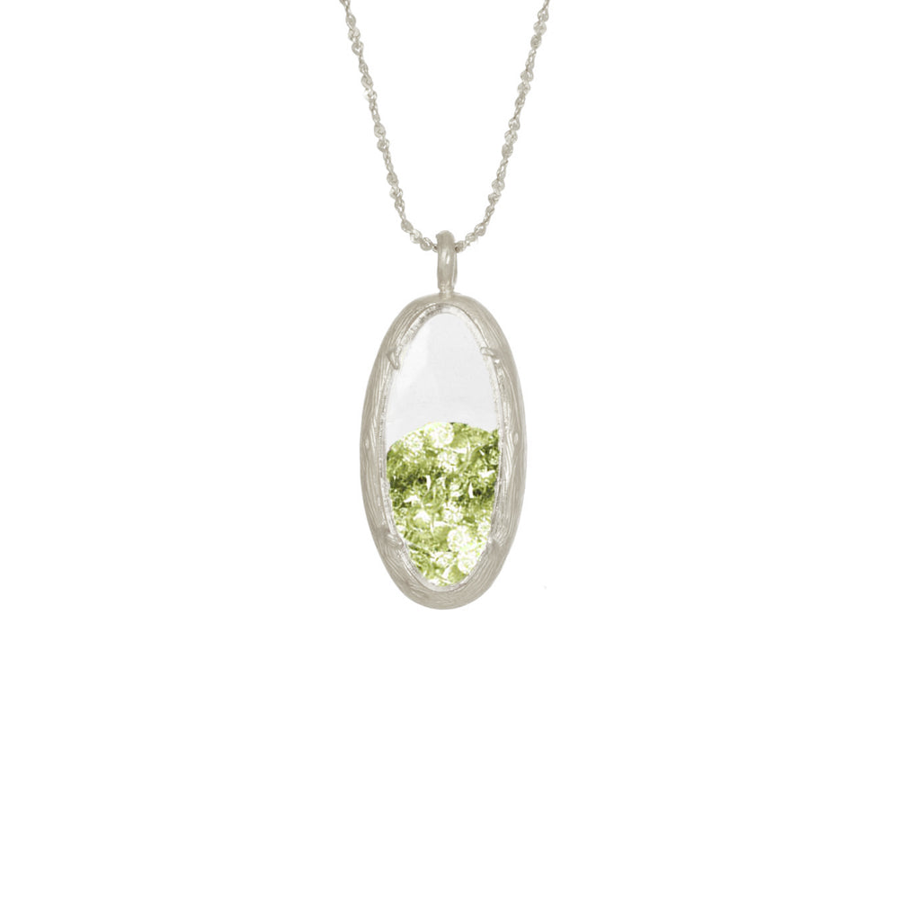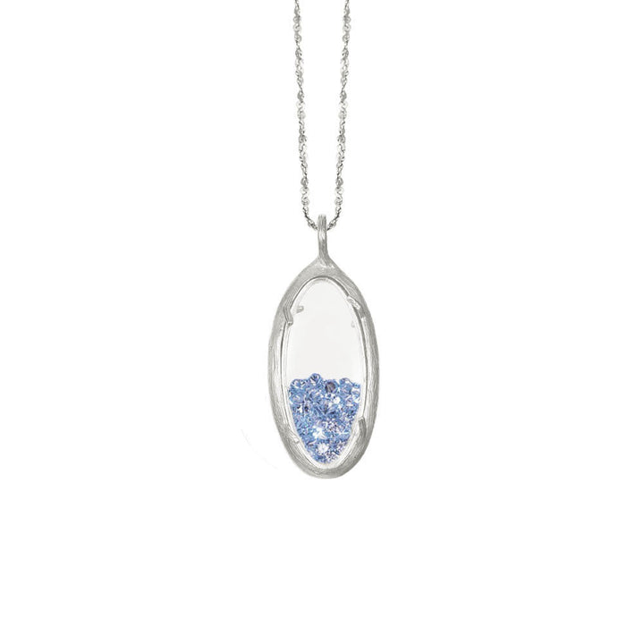 This Oval Shaker Necklace by Catherine Weitzman is a captivating showcase of dynamic color. Aqua crystals float inside a double-glass pendant framed in organically textured metal, making it a piece full of movement, light, and modern magic. Handmade in Hawaii.