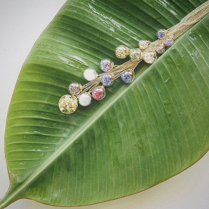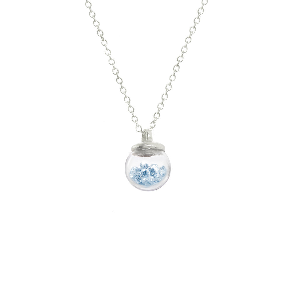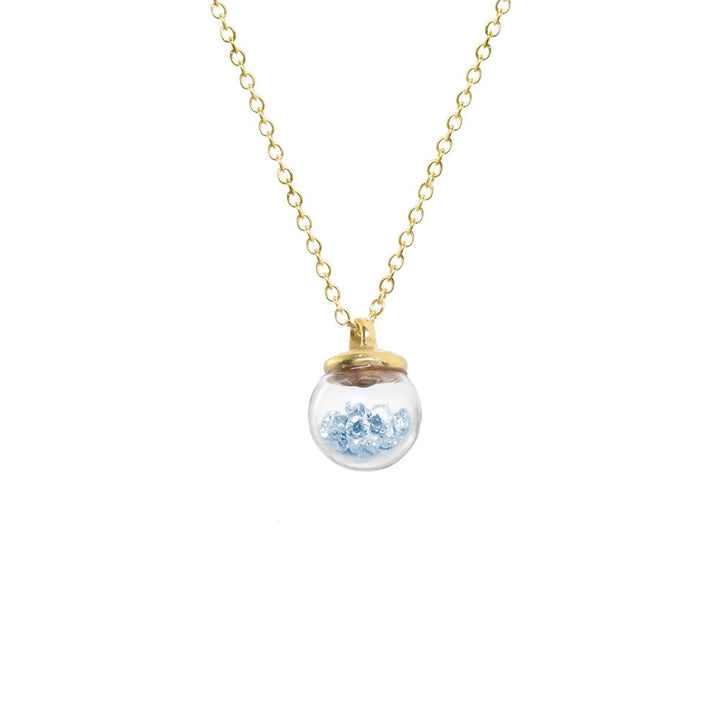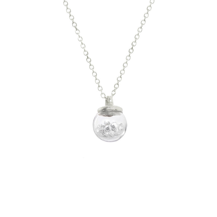This Mini Globe Necklace by Catherine Weitzman transforms playful design into elegant storytelling. A 10mm hand-blown glass globe holds luminous white crystals that glimmer and shift, suspended on a simple chain with an organically textured cap. A subtle showstopper. Handmade in Hawaii.