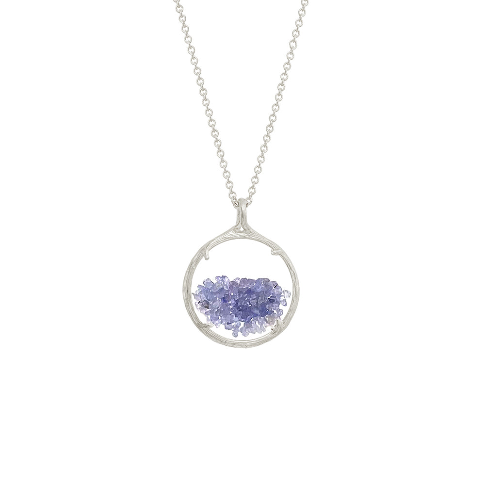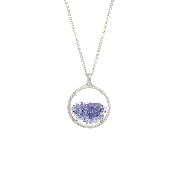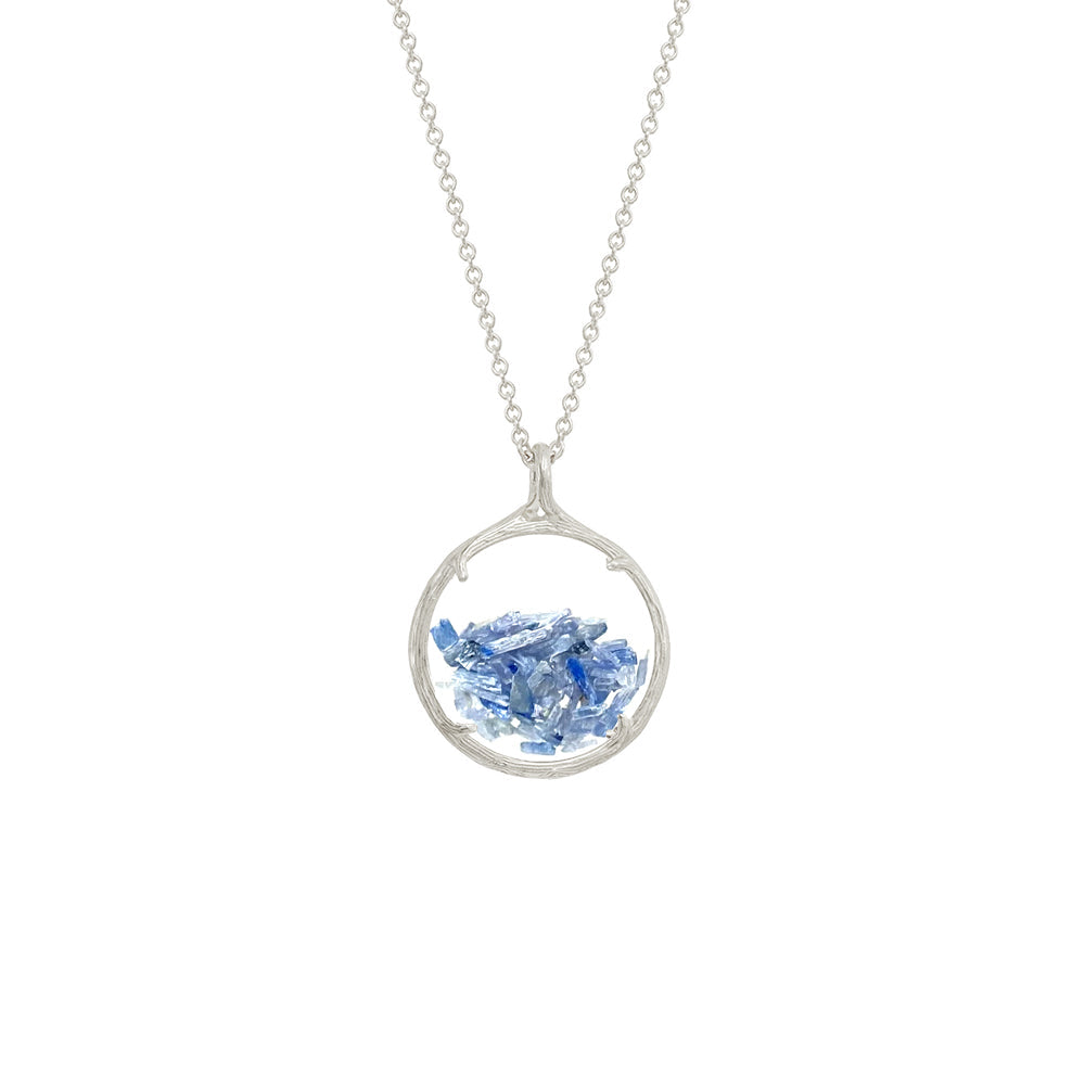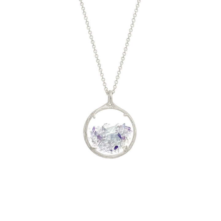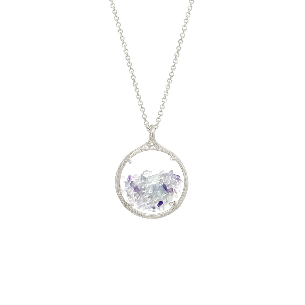 This Small Winter Shaker Necklace by Catherine Weitzman captures the magic of winter in motion. Free-floating crushed fluorite gemstones shimmer within a two-sided glass chamber, radiating cool tones of icy elegance. Framed by a softly textured, organic bezel, this pendant brings natural beauty and dynamic movement to your look. A unique piece for the season or any time you crave a touch of crystalline wonder.