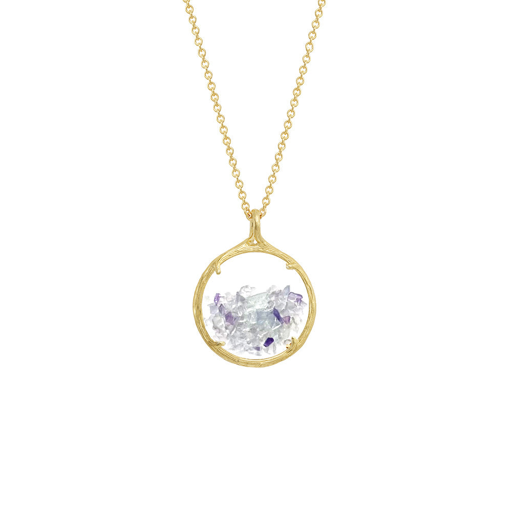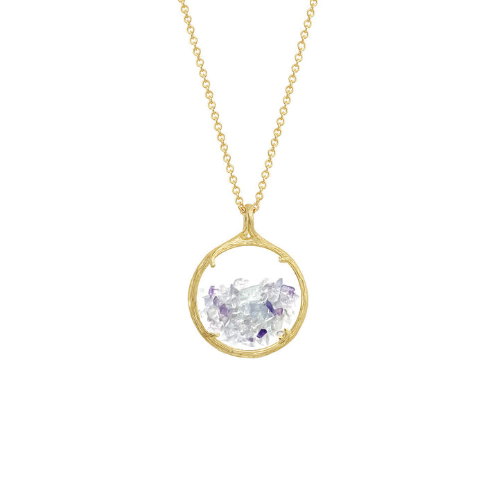 Handcrafted in 18k Gold Vermeil or Recycled Sterling Silver with crushed fluorite and watch glass. Pendant measures 21mm. Chain length is 18'.