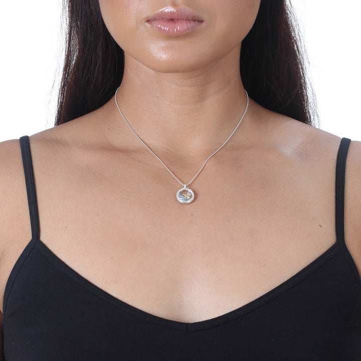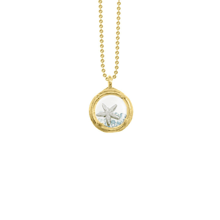 This Mini Shaker Necklace with Starfish by Catherine Weitzman captures a magical moment of marine beauty in miniature form. A delicate starfish, cast in lifelike detail, floats atop aquamarine crystals within a double-sided glass chamber. The softly textured branch frame adds an earthy elegance, making this petite piece a coastal treasure that’s full of shimmer and storytelling.