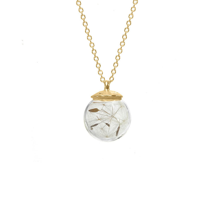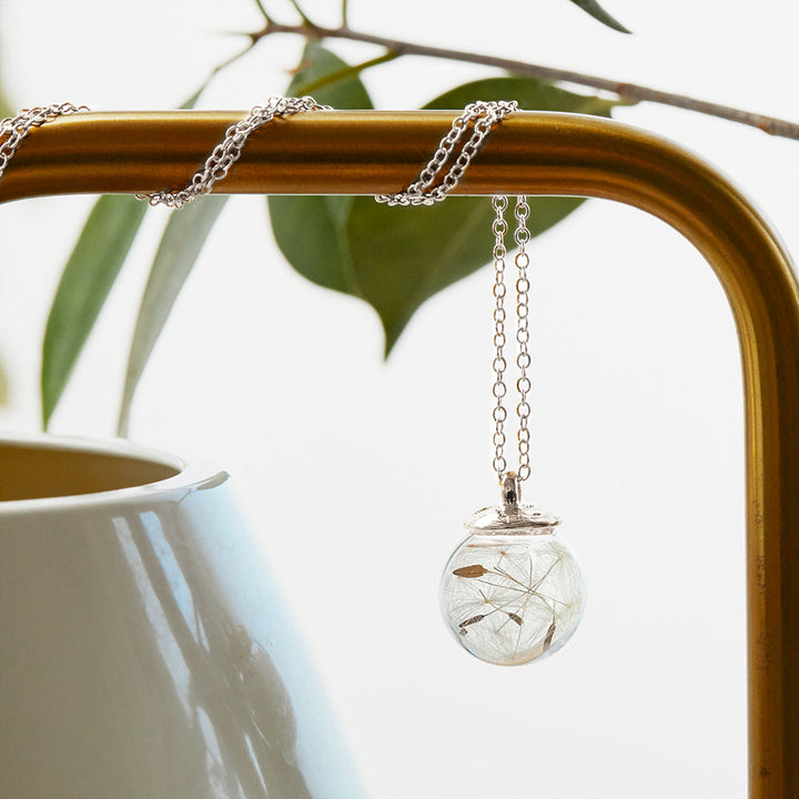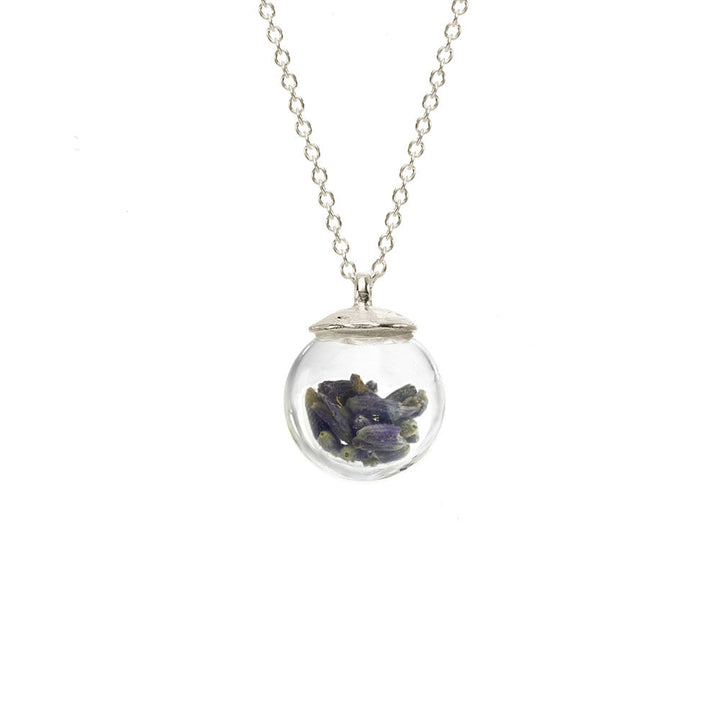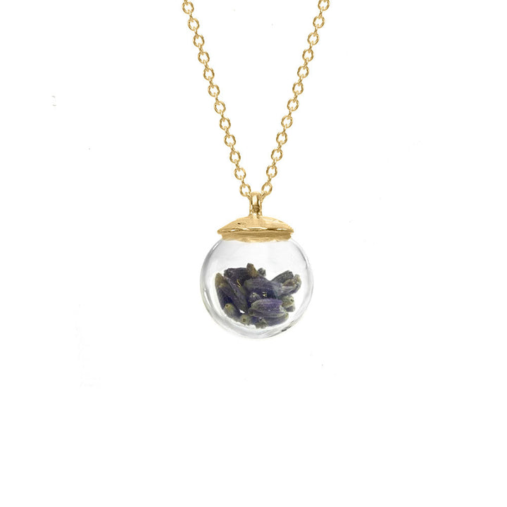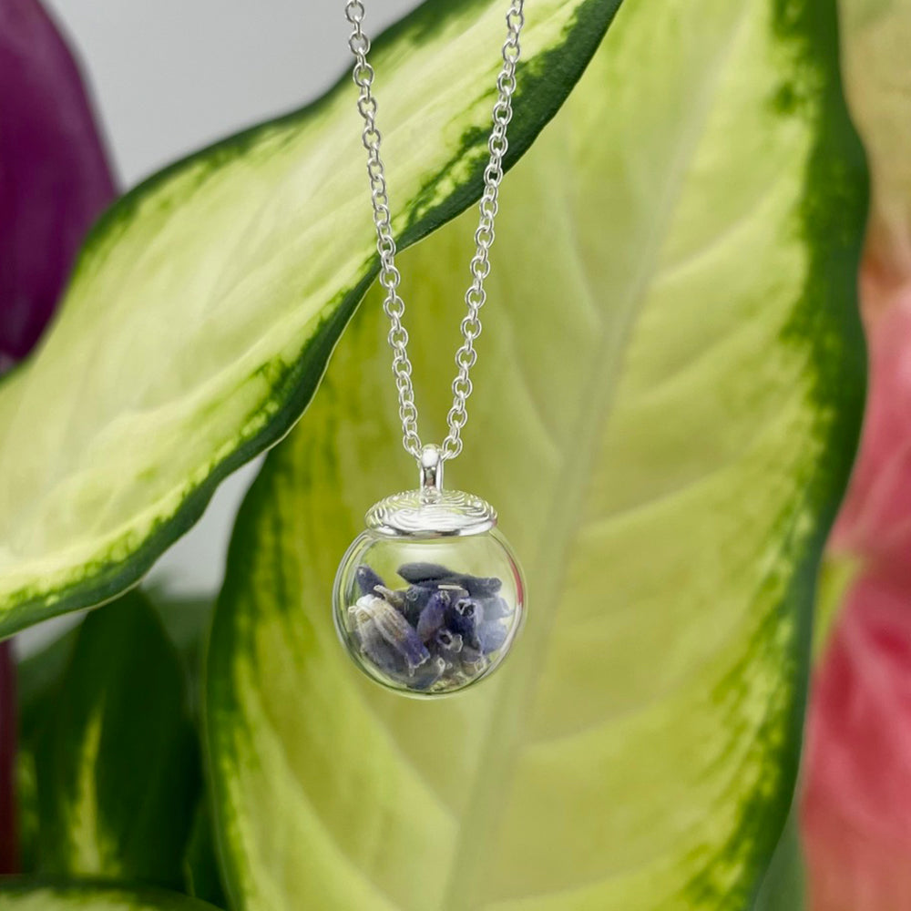Handcrafted in Silver Plate or Gold Plate with hand-blown glass and natural dried botanicals. Pendant measures 14mm. Chain length is 24'.