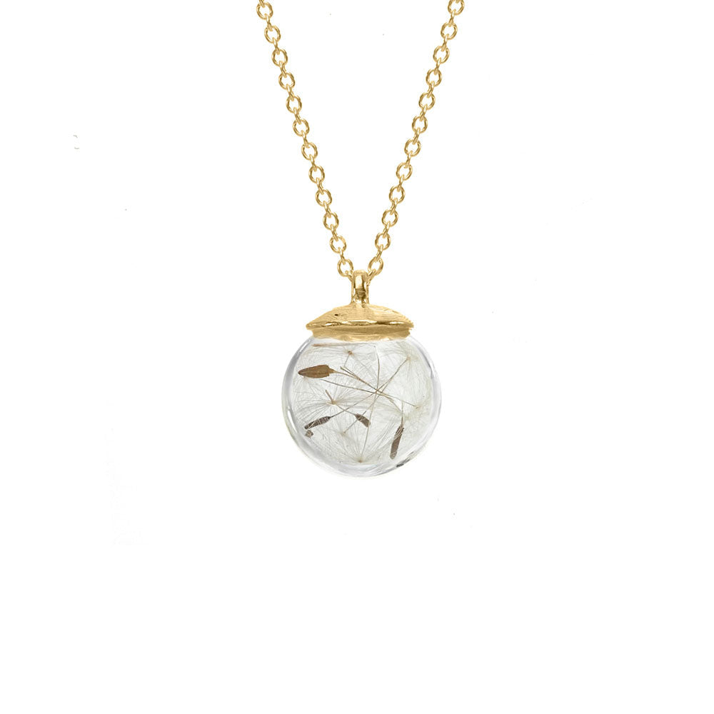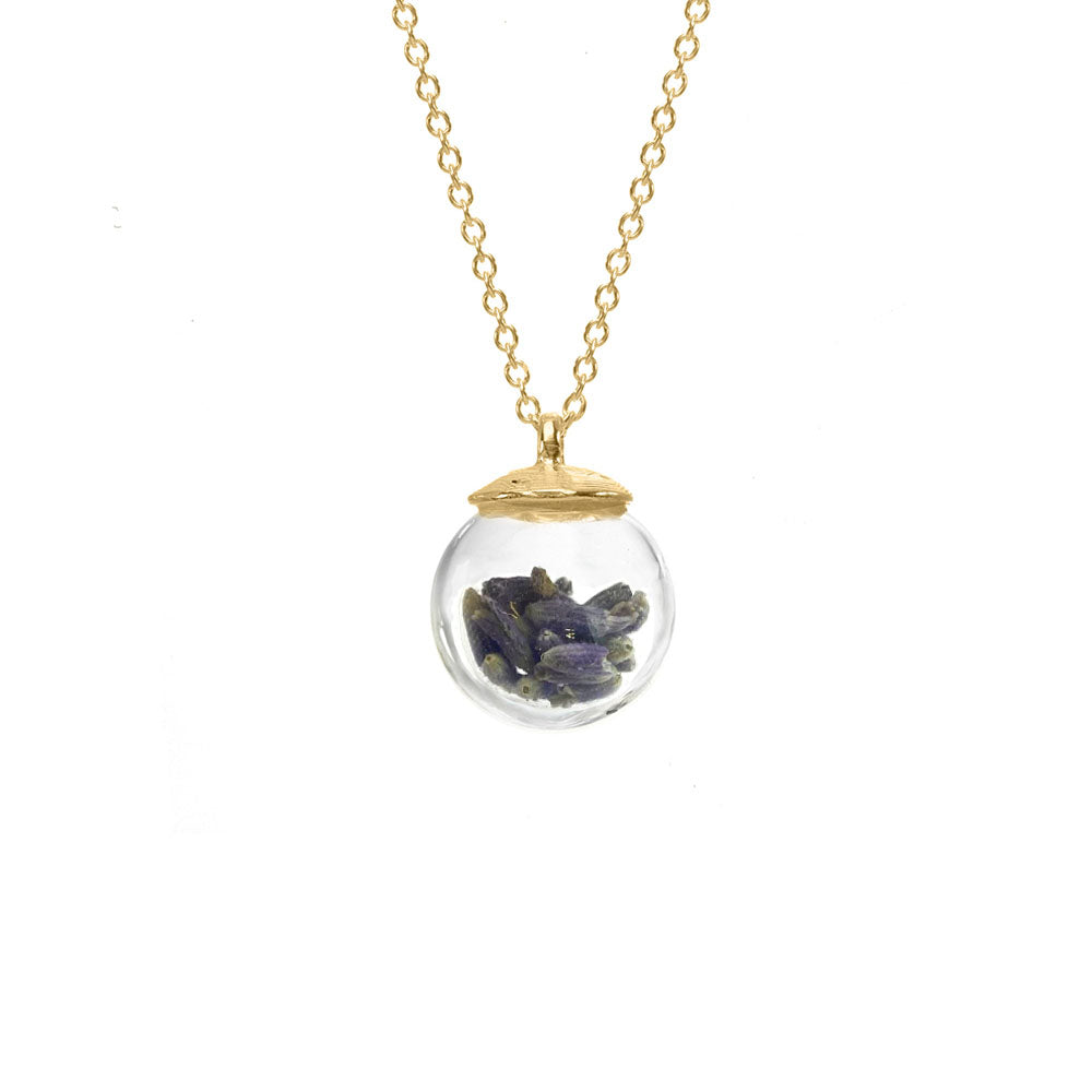 This Small Botanical Globe Necklace by Catherine Weitzman offers a magical window into the natural world. Suspended in hand-blown glass, lavender florets symbolize serenity and grace, while dandelion seeds evoke hope and dreams. A poetic keepsake close to the heart.