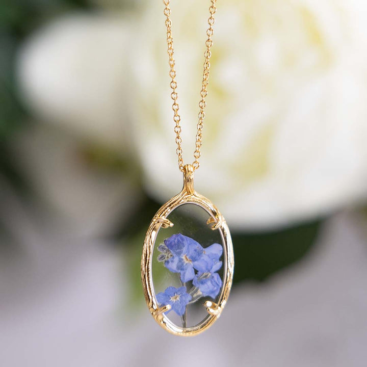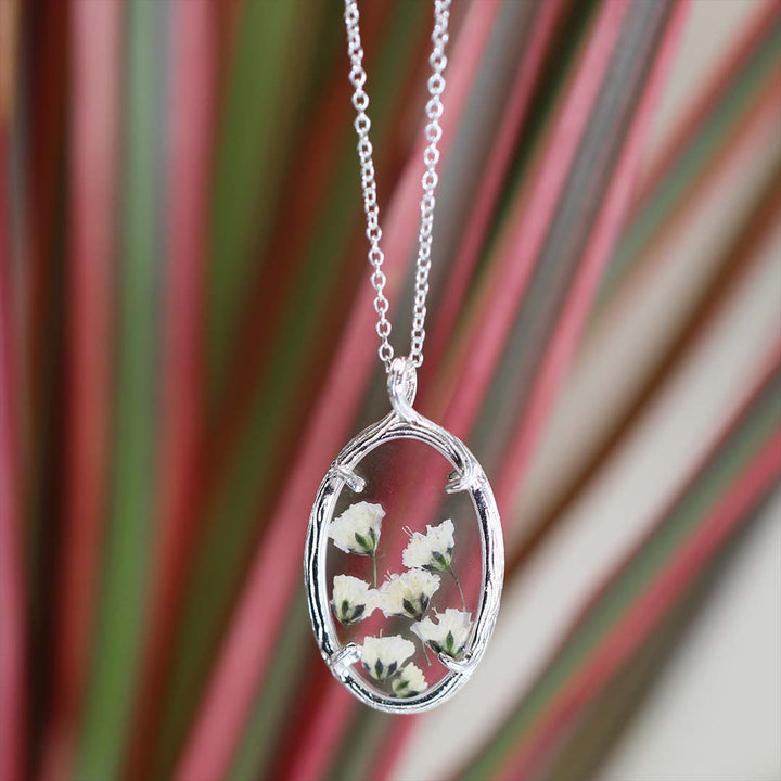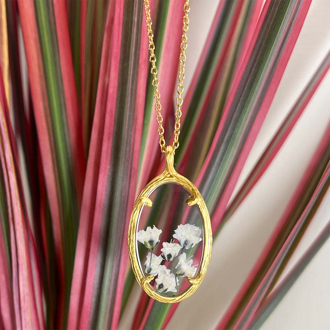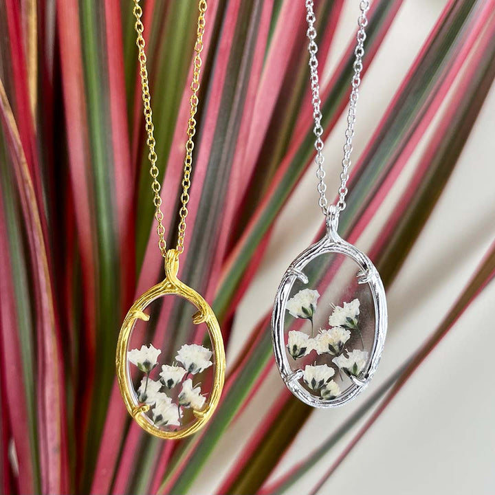 This Oval Botanical Necklace by Catherine Weitzman is a timeless keepsake celebrating delicate florals and heirloom style. Featuring hand-pressed flowers encased in a glass palette and framed in soft metallic tones, it's available with either Forget Me Nots or White Baby’s Breath. A modern treasure rich with personal meaning.