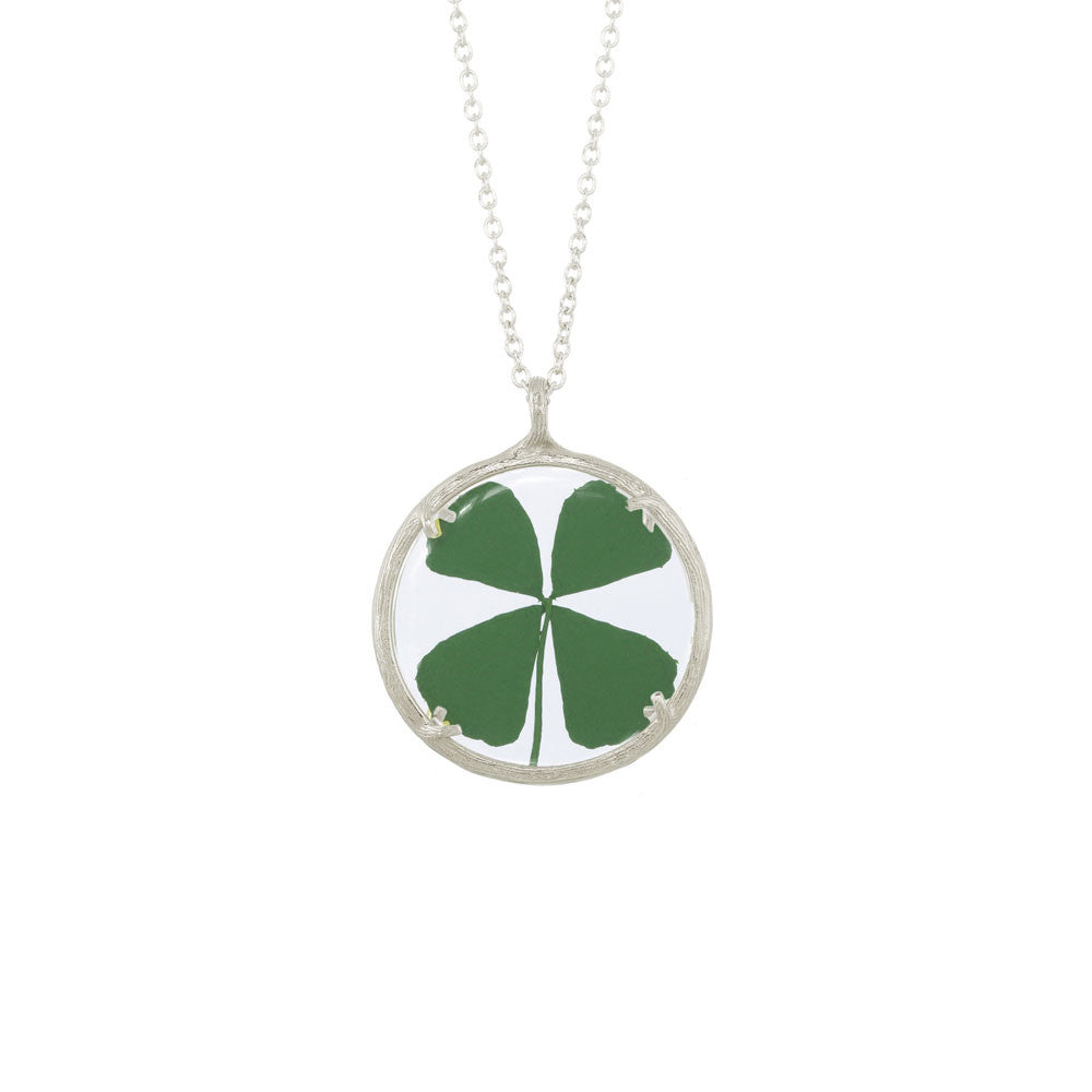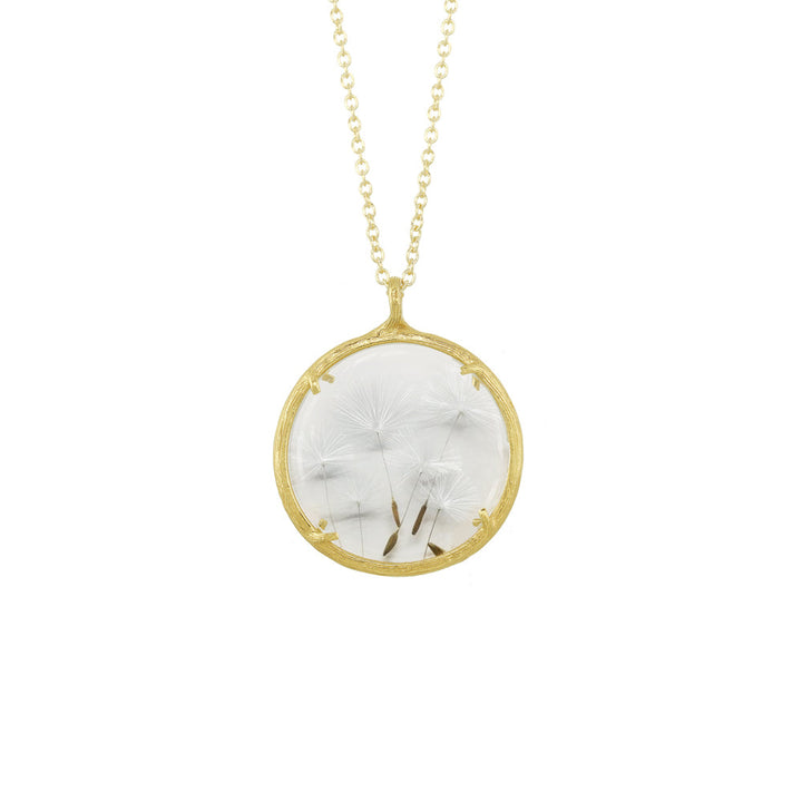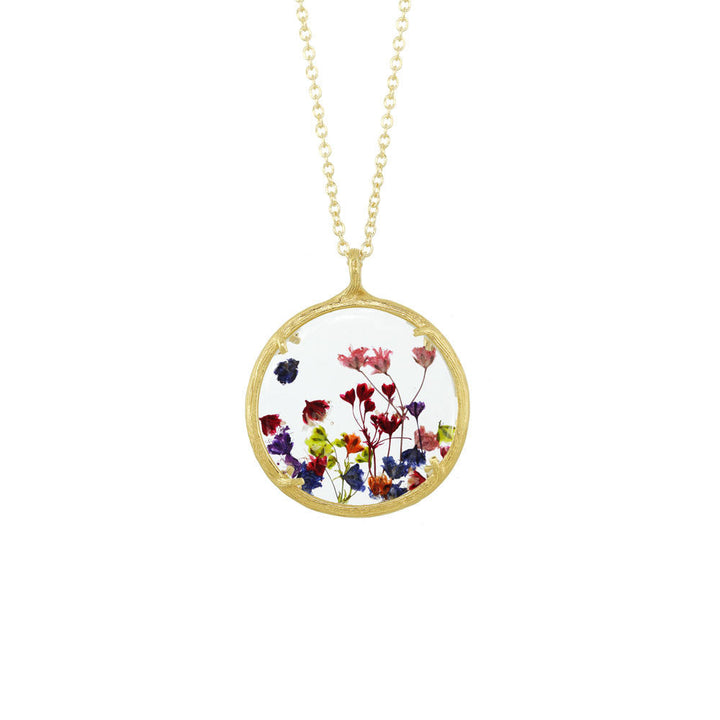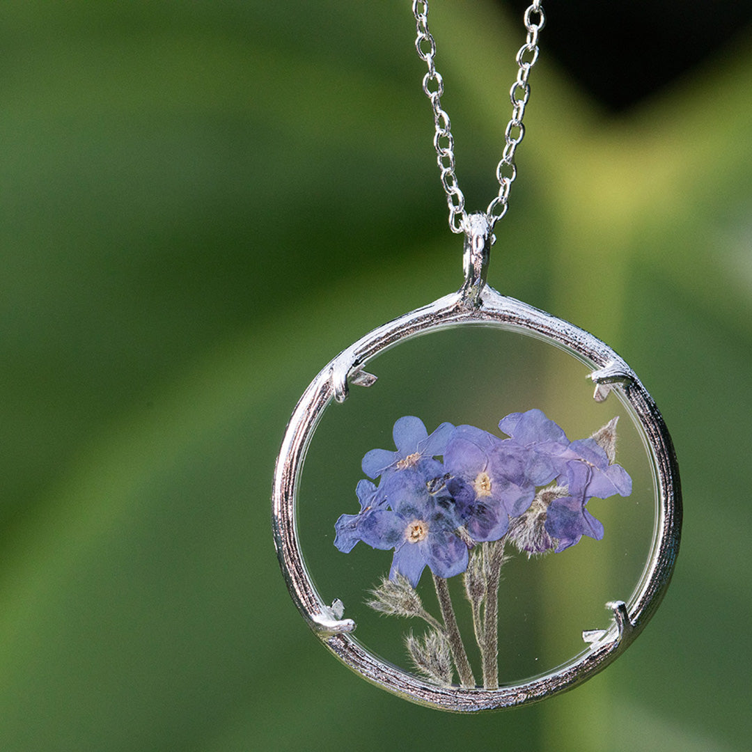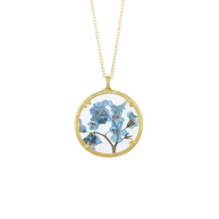 Handcrafted in 18K Gold Vermeil or Recycled Sterling Silver with hand-pressed Forget Me Nots and watch glass. Pendant: 25mm. Chain: 20'.