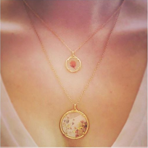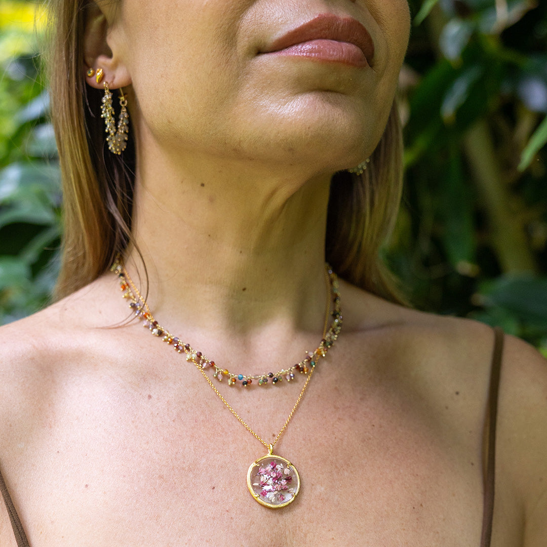 This Large Botanical Necklace by Catherine Weitzman is a window into nature’s artistry. Featuring a medley of bright flowers preserved in a glass chamber, the pendant brings botanical beauty to life within a softly textured branch-like frame. A heartfelt piece that speaks to timeless natural elegance.