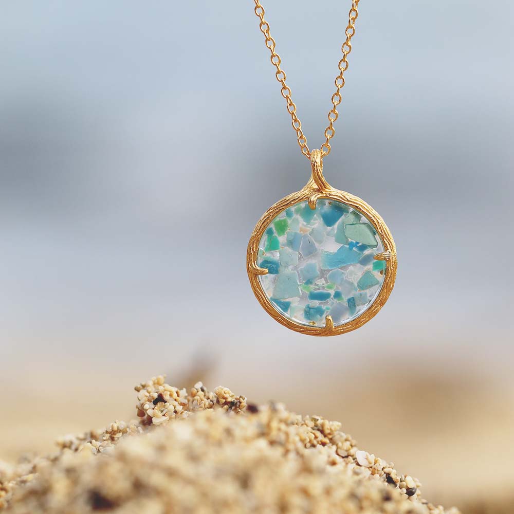 Crafted in Gold Plated or Silver Plated metal with eco-friendly resin and recycled microplastic. Pendant: 20mm. Chain: 18' + 2' extension.