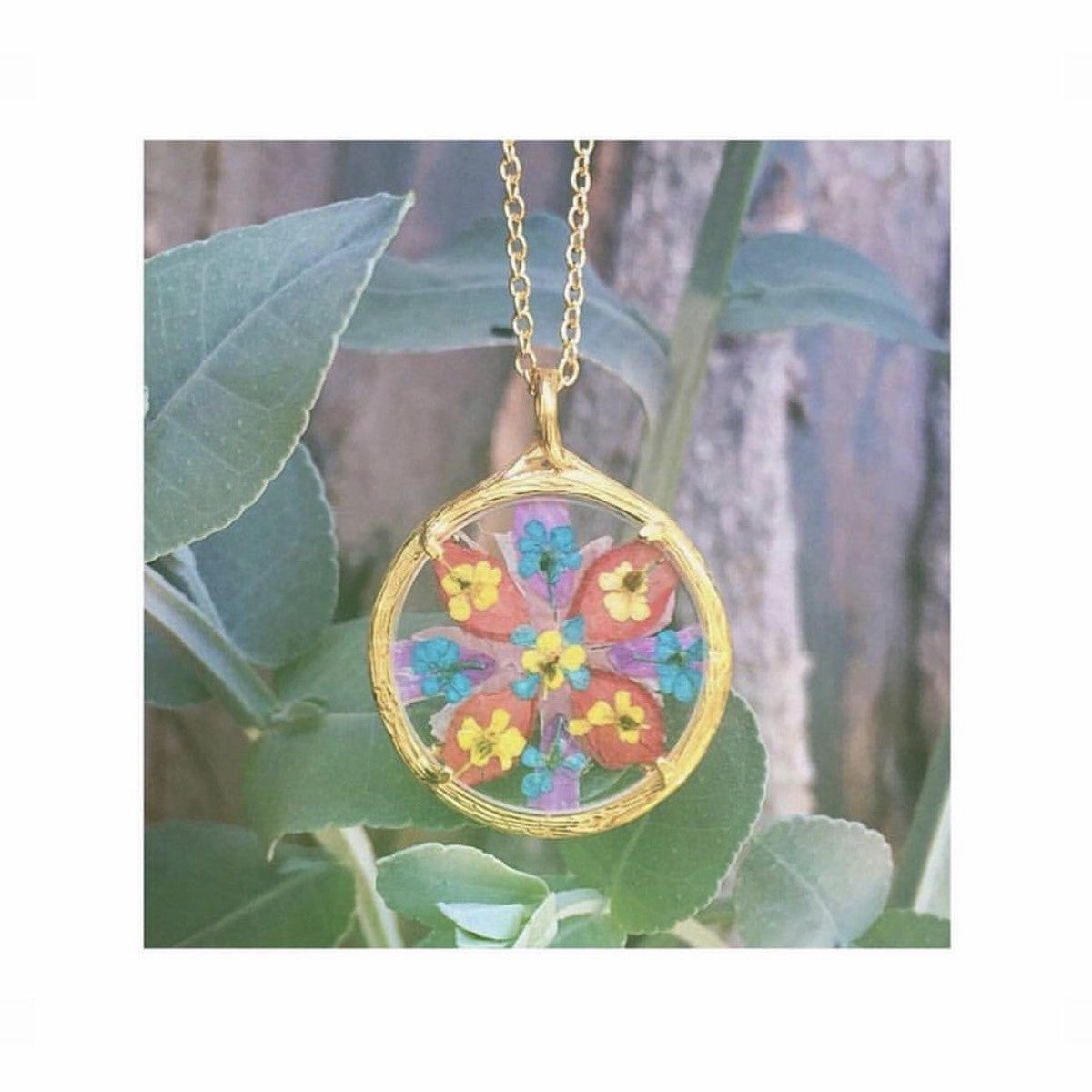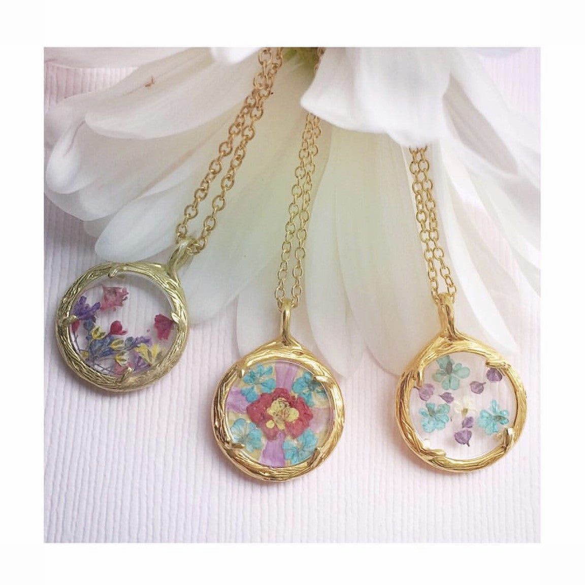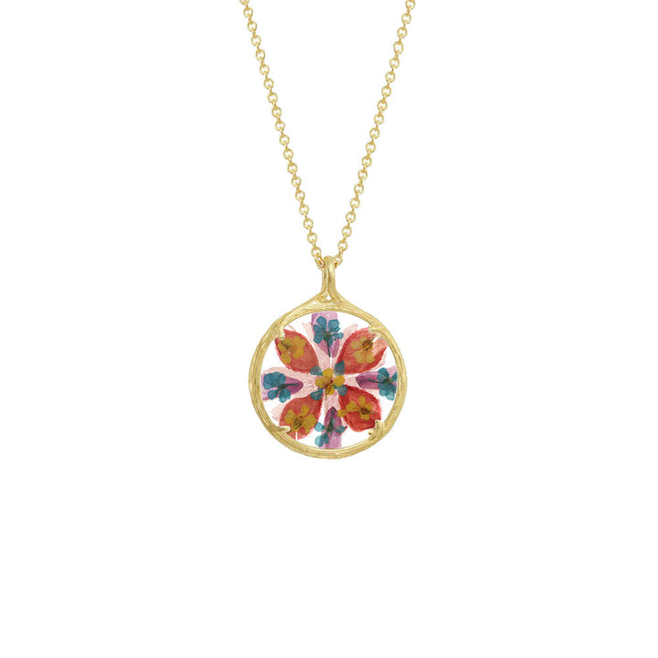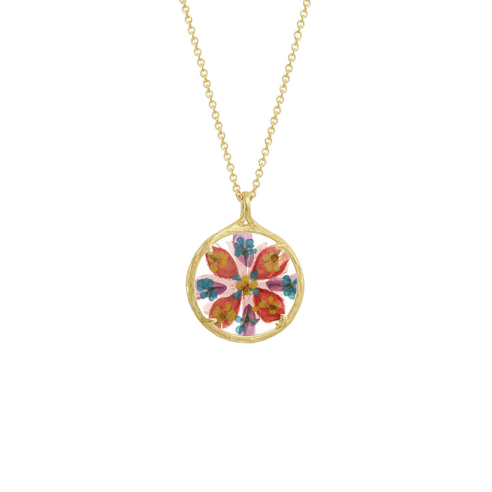 Handcrafted in 18k gold vermeil or recycled sterling silver with hand-pressed flowers and watch glass. Pendant: 21mm. Chain: 18'.
