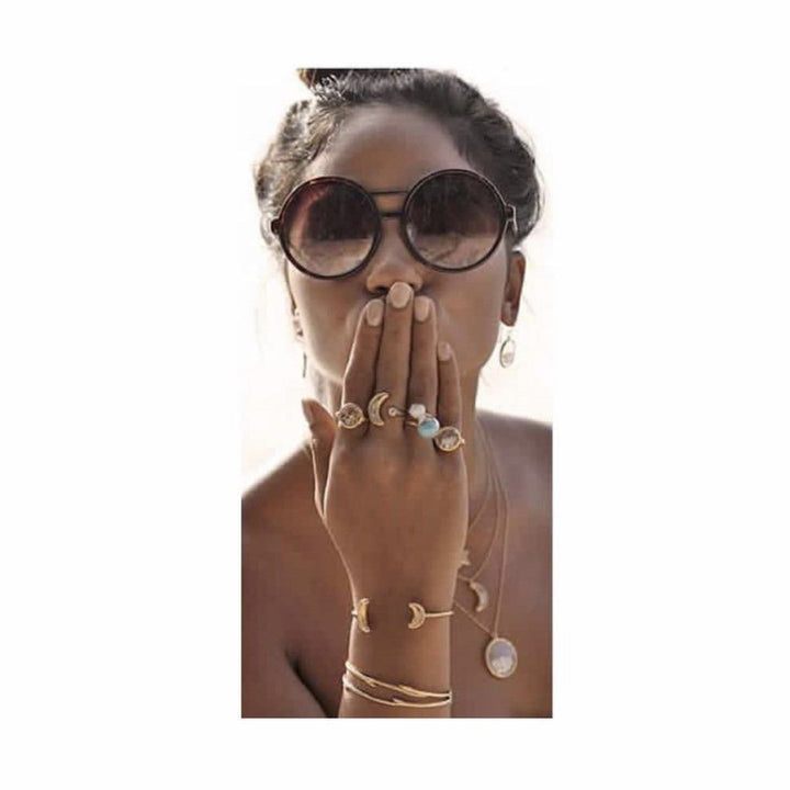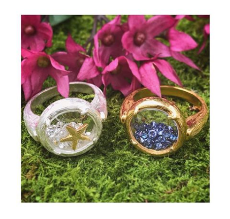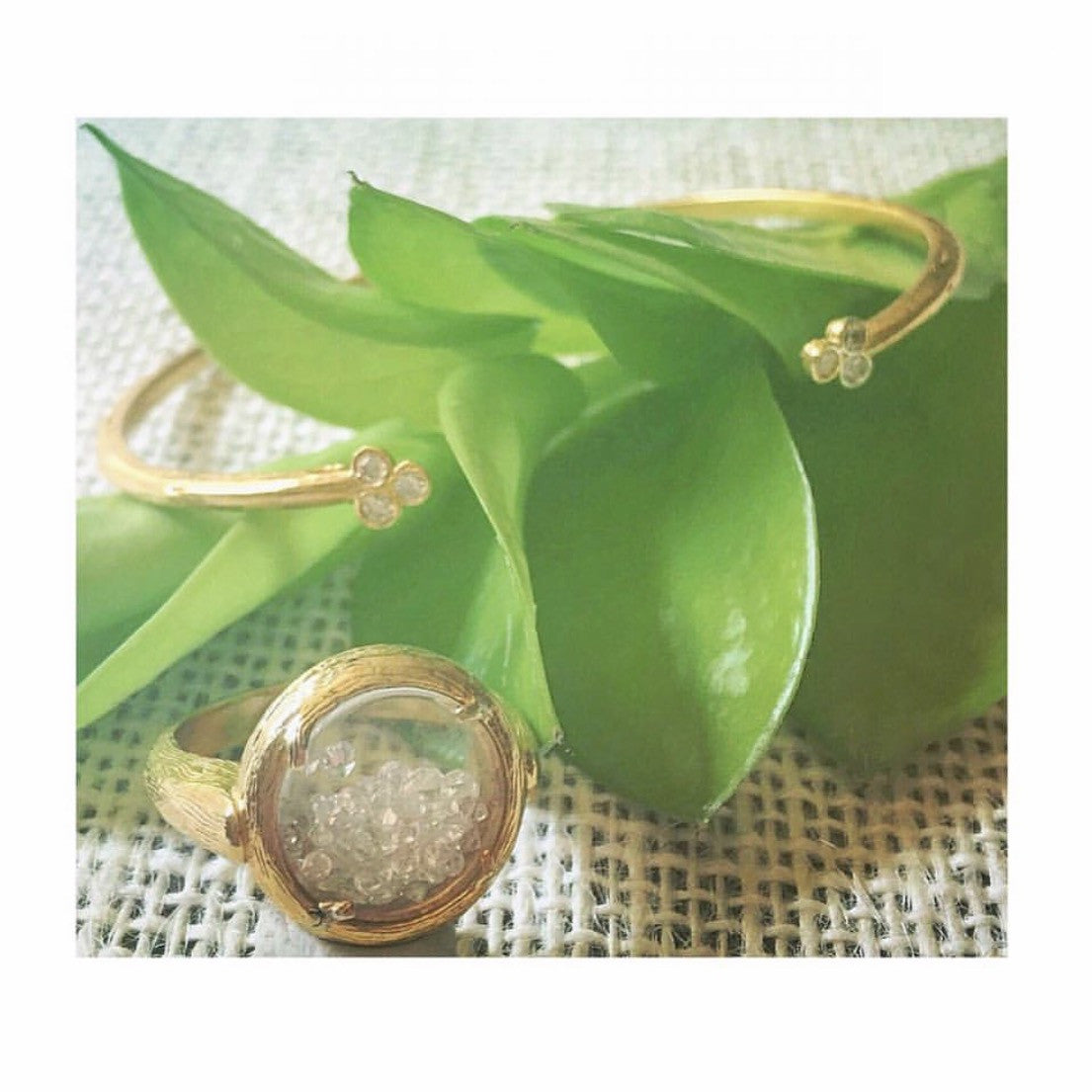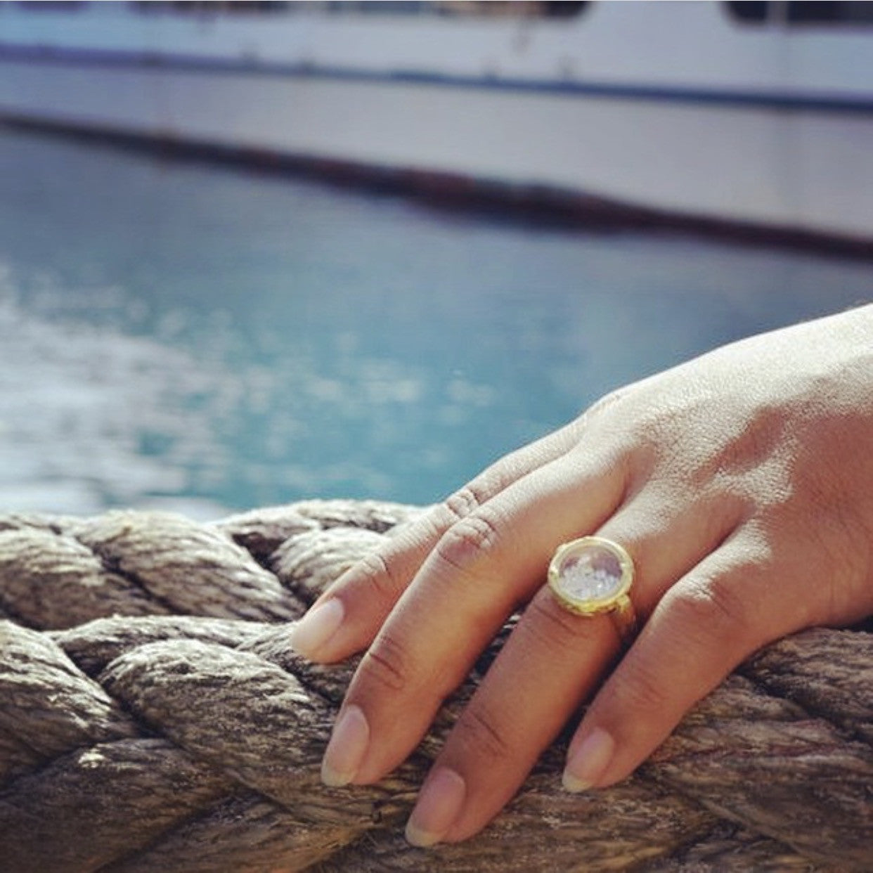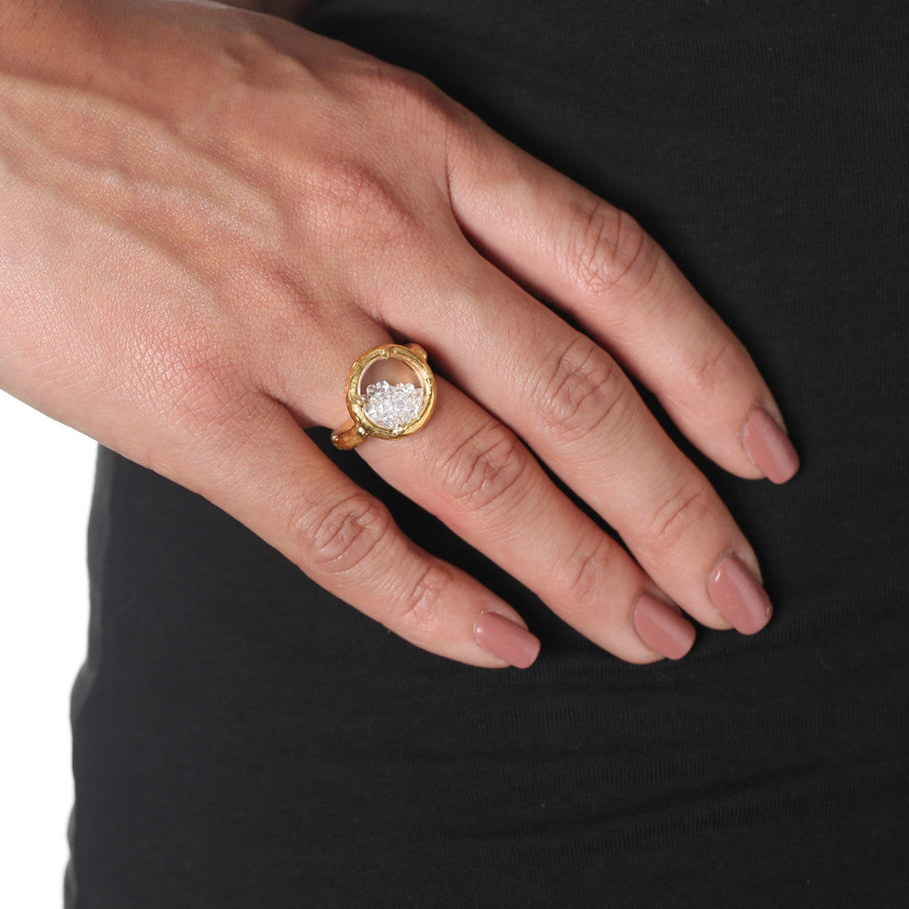 This Shaker Ring by Catherine Weitzman encapsulates magic in motion. A two-sided glass chamber encases white crystals that shimmer with vibrant energy, framed by a softly textured, branch-like band. A bold yet ethereal piece that makes a statement every time you move. Handmade in Hawaii.