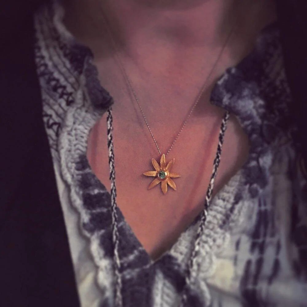 Sandrine B. is a New York-based jewelry designer who blends artistry with mindful craftsmanship. With a deep commitment to wearable art, Sandrine believes in preserving memories and amplifying the beauty of nature. Her sustainable artisan jewelry reflects the moments of life that resonate with her, be it in her hometown, on her travels, or at her childhood homes in Lyon and Corsica, France. Handcrafted with love and intention, her jewelry is a reminder that we are more than what meets the eye.Style notes: This pendant is a play on nature's delicate texture. The design is a rendering of a flower's delicate petals. Sandrine made the flower out of wax that she textured with a special bur. The bail is carefully hidden in the back of the pendant so that it does not interrupt the delicate design. The flip side of the pendant is carefully finished. You can layer the pendant by pairing it with other necklaces or you can keep a minimalist style and wear it by itself. You can experiment with different types or chains and textures to create a unique look. Because this pendant has a colored stone, consider incorporating the color into your outfit such as wearing a scarf in a coordinating color. Have fun experimenting and finding the look that works best for you!Price: Please note price may vary due to exchange rate differences or shipping, duties and taxes. Price may also vary with materials choice. Final price is calculated at checkout at the designer's website. Materials: 18k yellow gold with green tsavorite.Dimensions: The pendant is about 22 m round and 3.5 mm high.