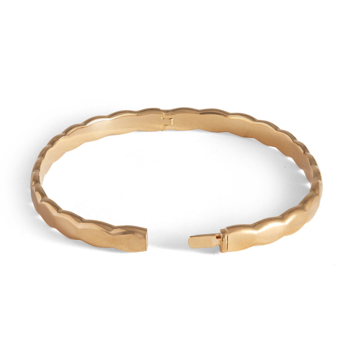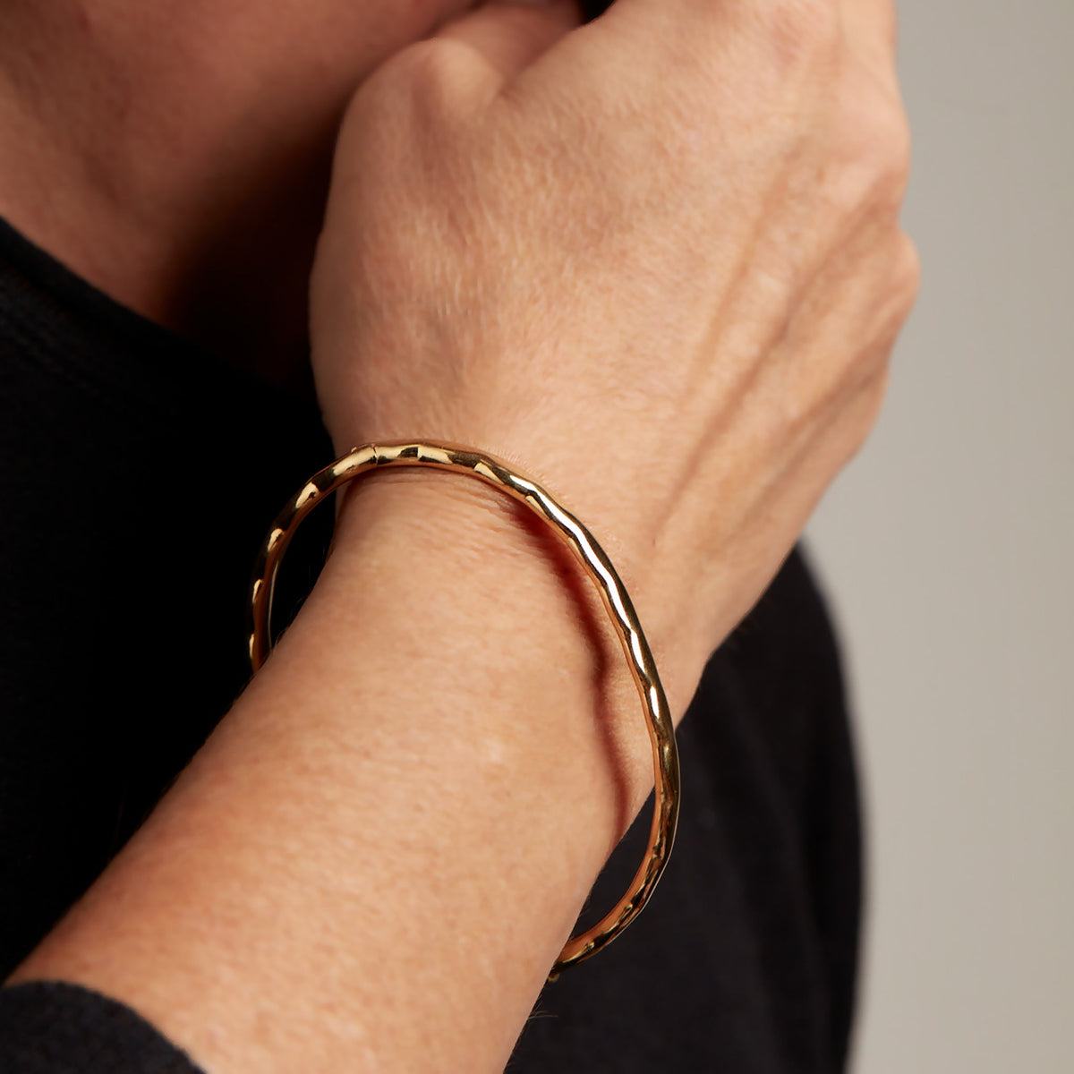 Made from premium 3-micron thick gold vermeil, the bangle has a silver base with a luxurious 18k yellow gold coating. Its oval shape gives it a unique, refined look, designed for long-lasting beauty with proper care.