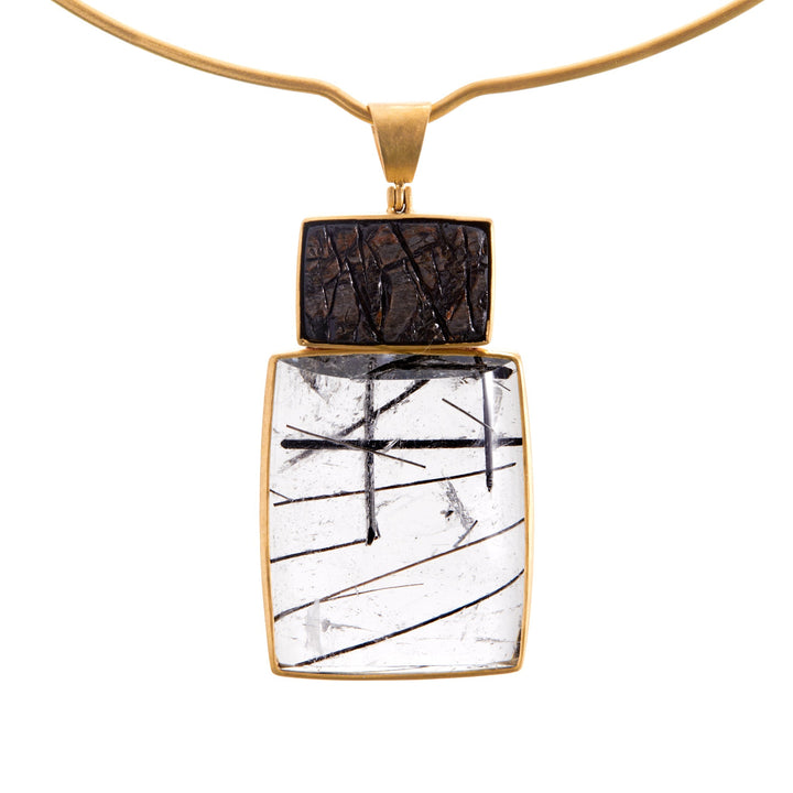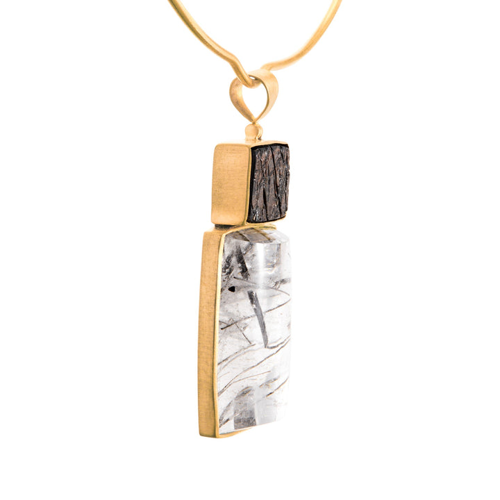 Rutilated quartz and natural-surface obsidian set in 18k yellow gold. Pendant only; compatible with handmade 18k yellow gold torque necklace.