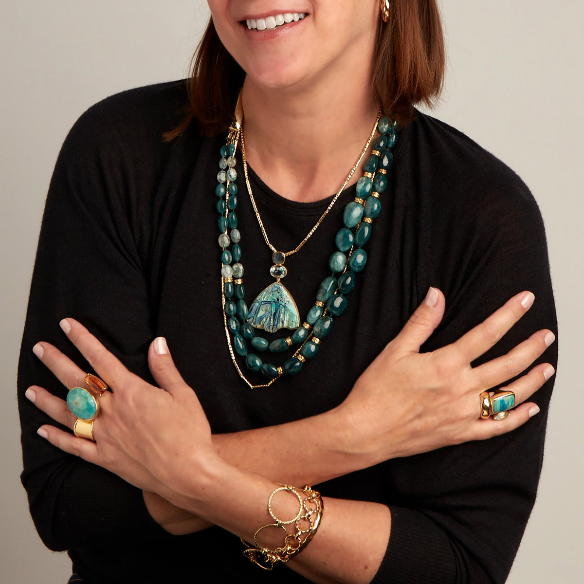 Labradorite, aquamarine, and native copper chrysocolla set in 18k yellow gold. Pendant only; compatible with handmade 18k yellow gold torque necklace.