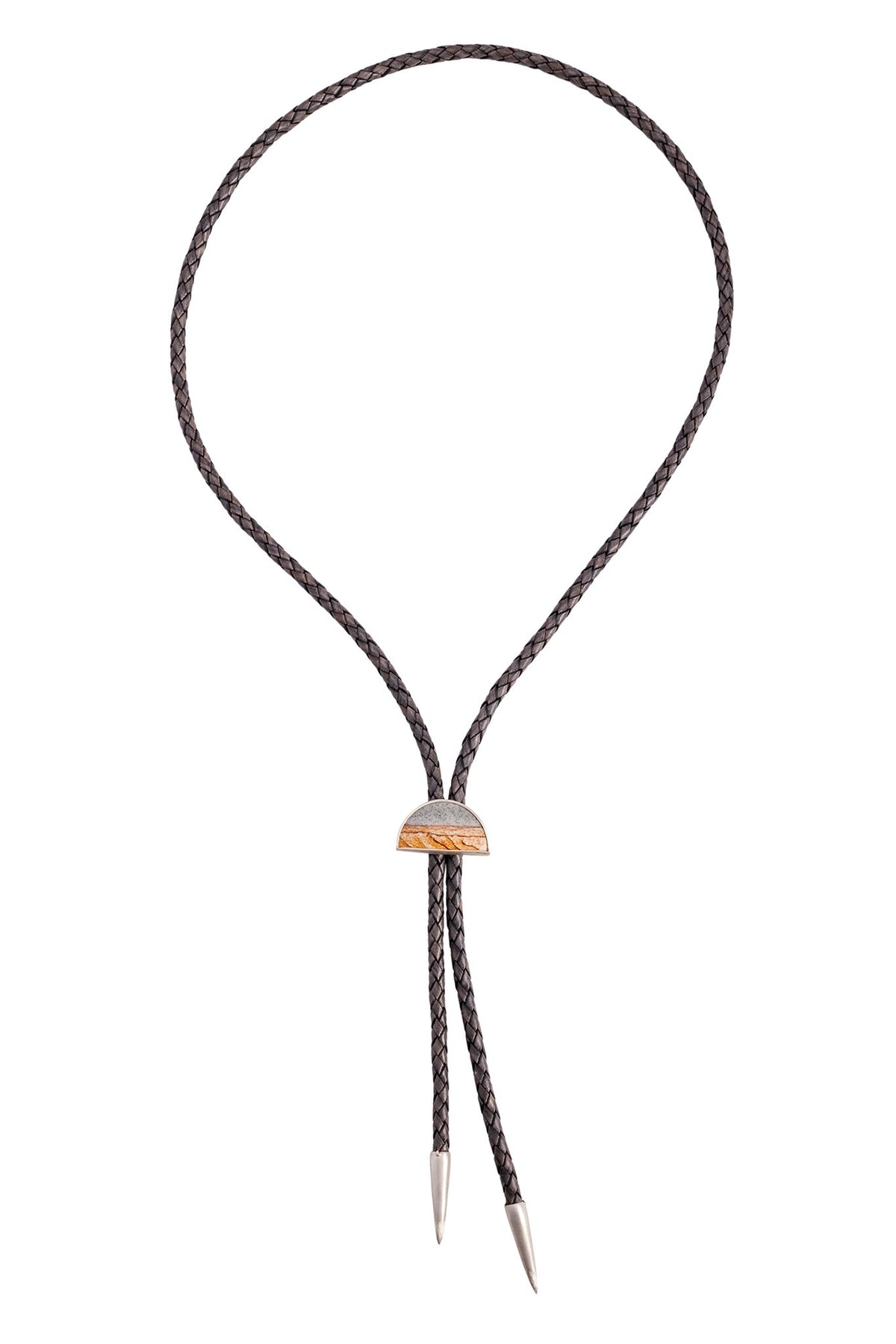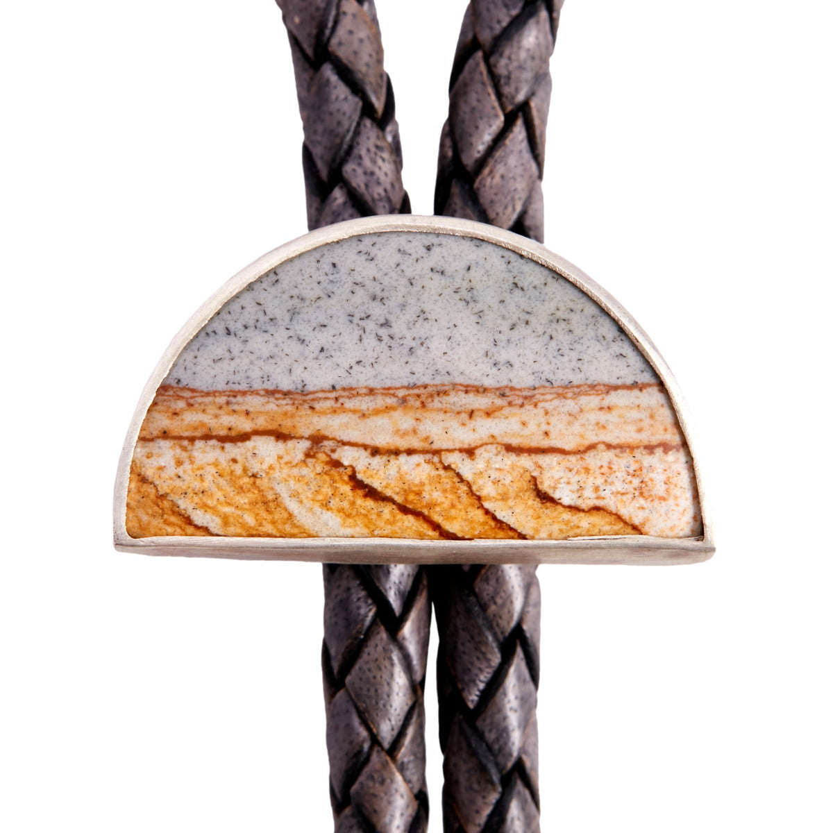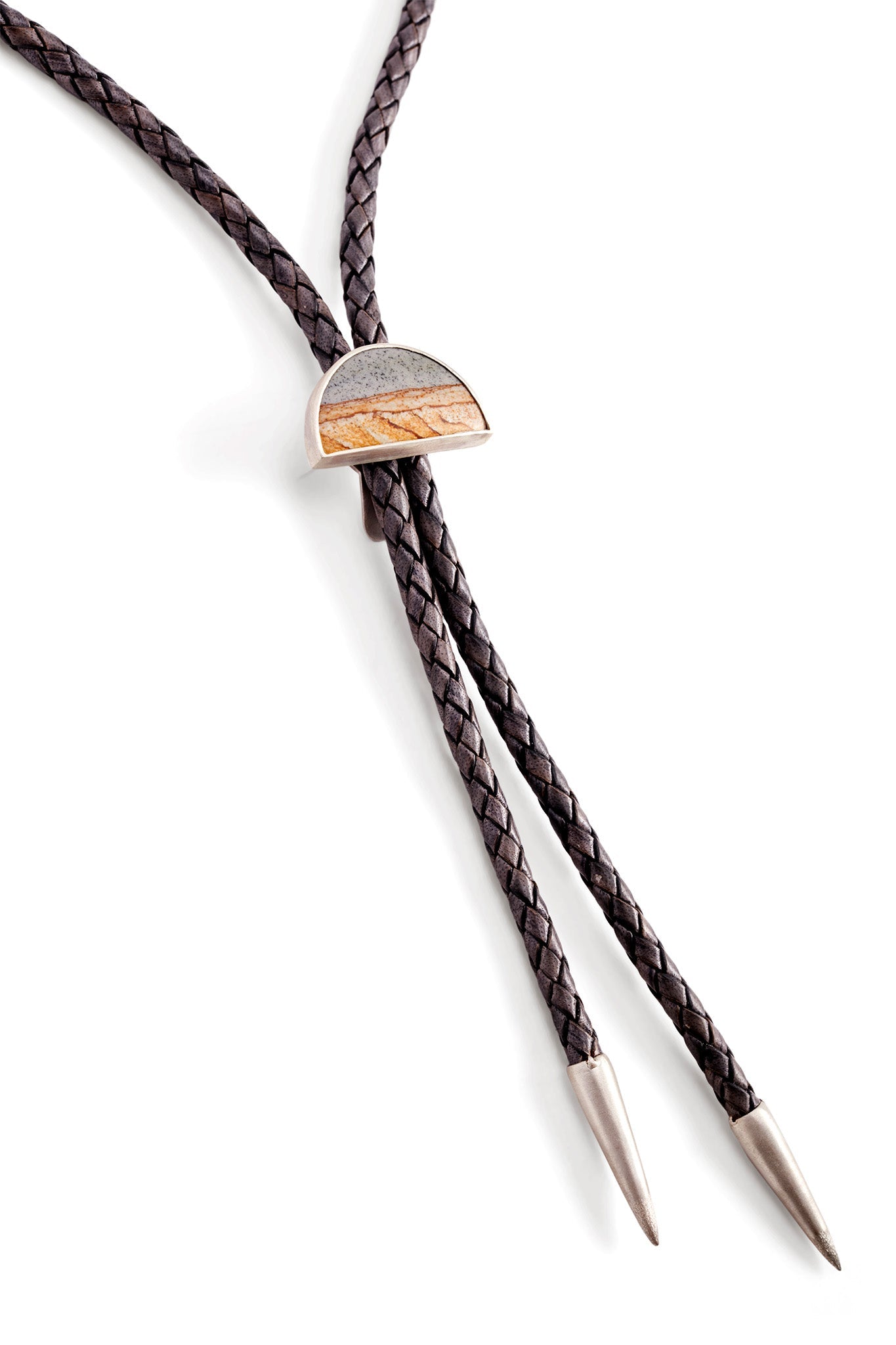 This Half-Moon, Starry Night Jasper Bolo by Daria de Koning evokes desert nights and cosmic stillness. Centered on a mysterious jasper cabochon that resembles a galaxy, this bolo-style necklace is grounded in rustic elegance. The sterling silver setting and supple leather cord nod to traditional Western influences, reimagined with a sculptural, minimalist twist.