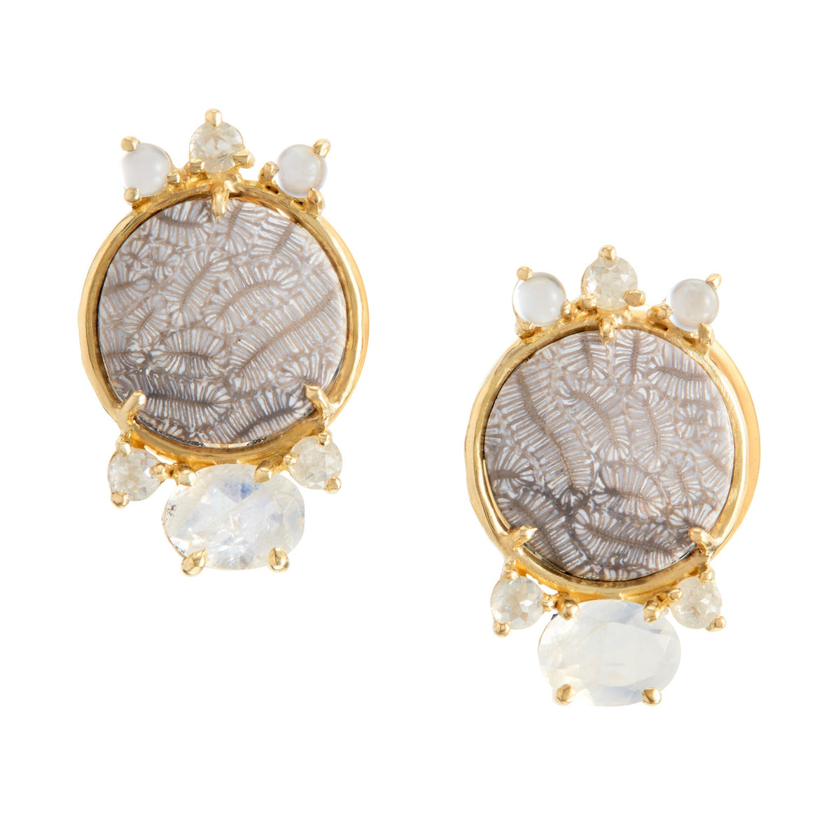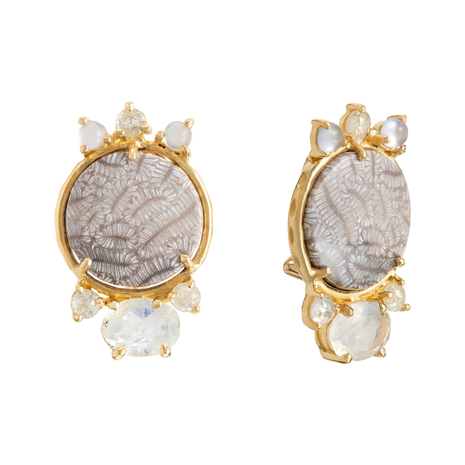 These Classic Small Earclips 1125 by Daria de Koning feature fossilized coral with an ethereal fern pattern, set off by moonstone shimmer and the soft gleam of grey diamonds and chalcedony. An ode to ancient beauty reimagined, these earrings are quietly captivating and uniquely elegant.