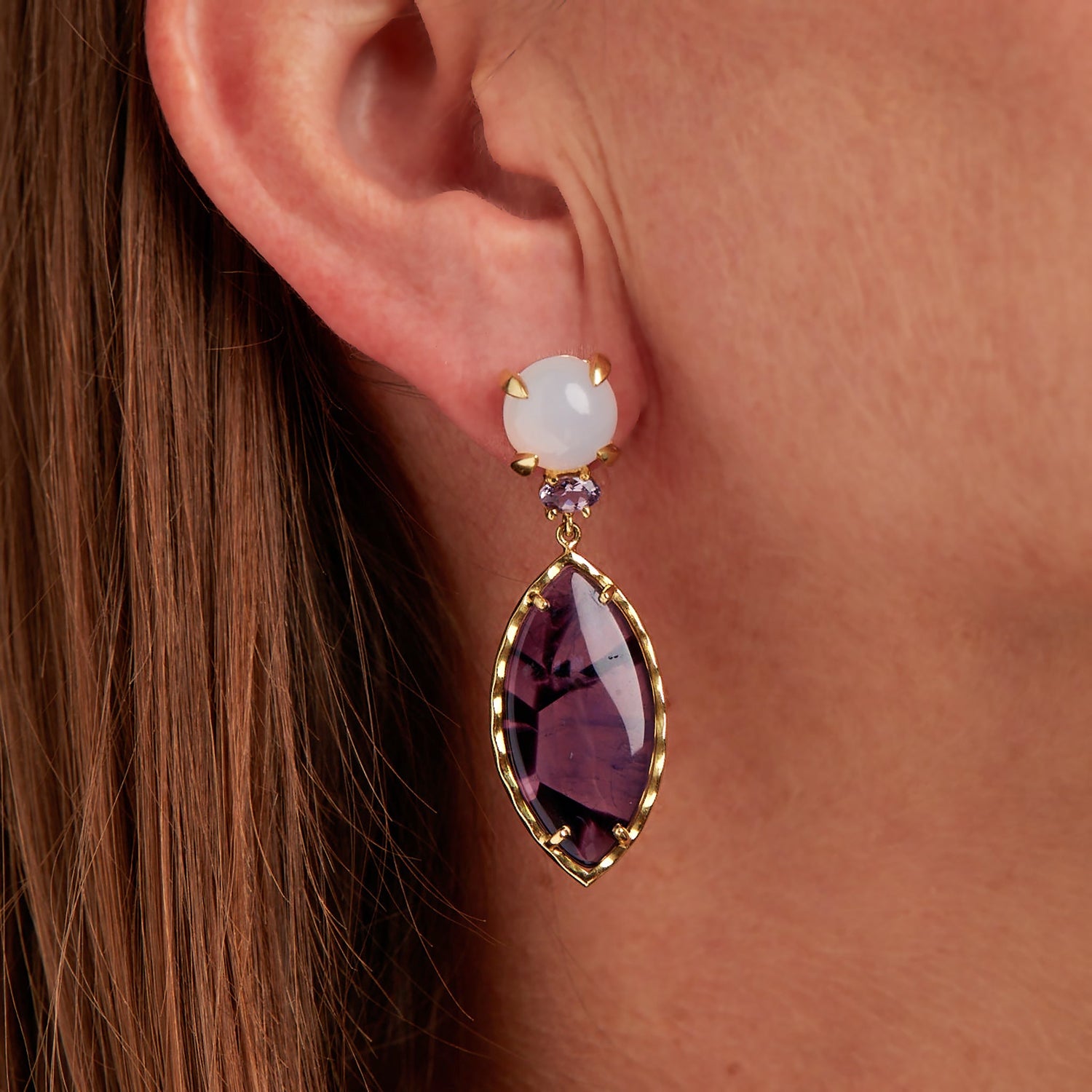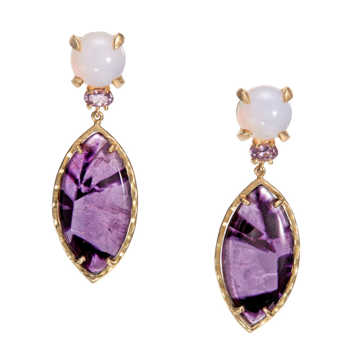 Chalcedony, purple spinel, and amethyst set in 18k yellow gold. 10mm top stone. Post back for pierced ears.