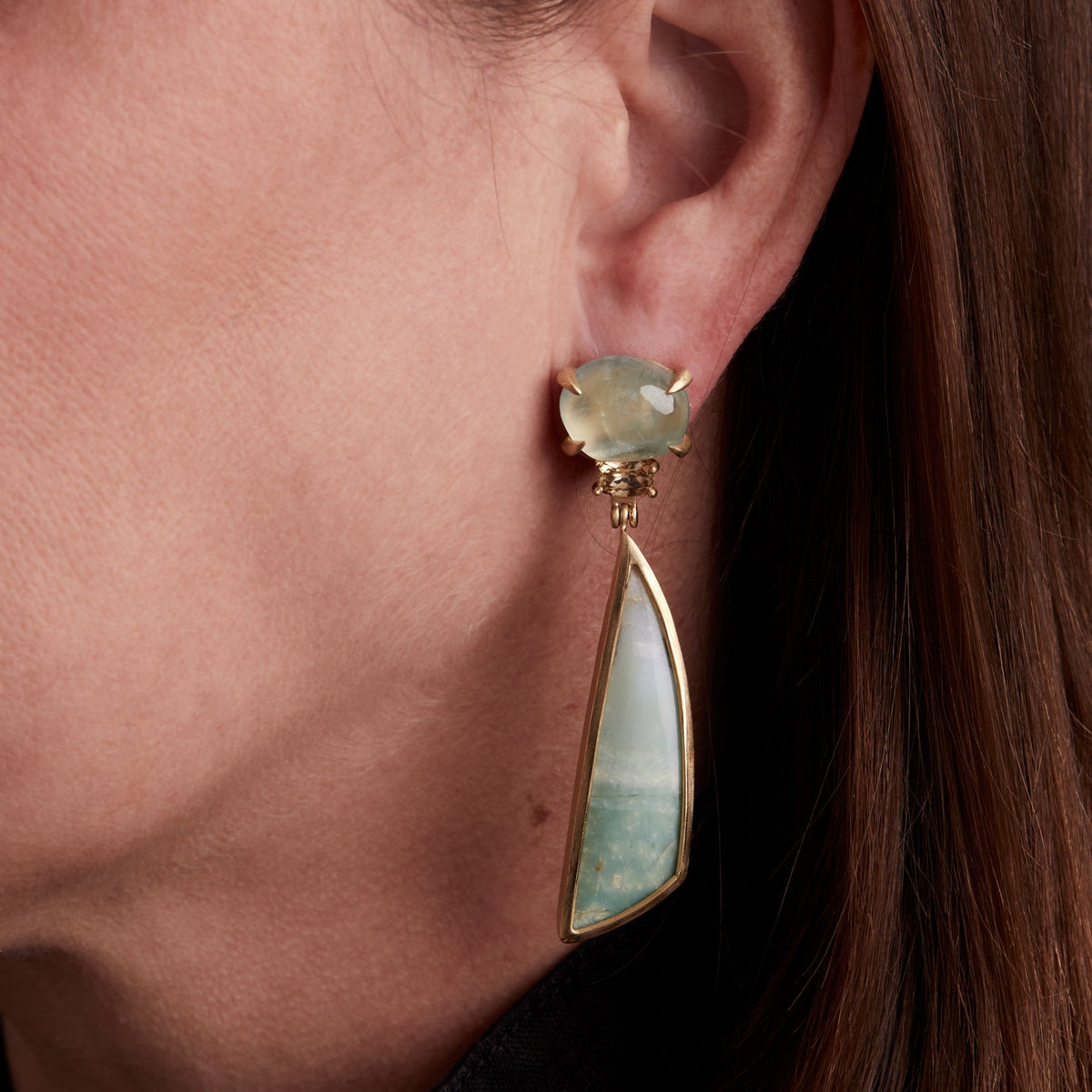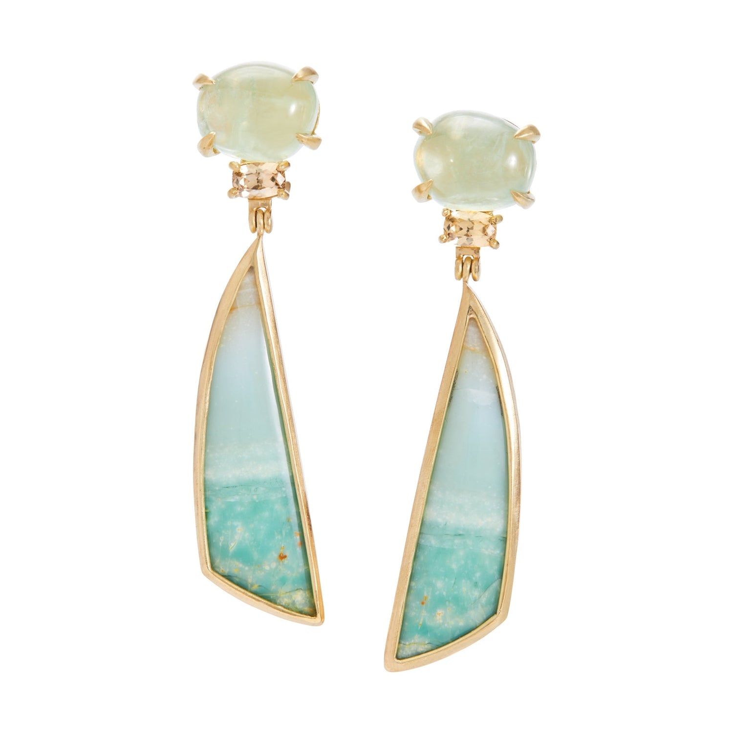 These Landscape: Ocean, Sail Earrings by Daria de Koning ride the horizon with a windswept blend of color and movement. Prehnite, zircon, and ancient petrified opalized wood form a seaborne palette that glows with translucence and depth. The earrings speak to voyages, discovery, and the beauty of water-worn treasures.