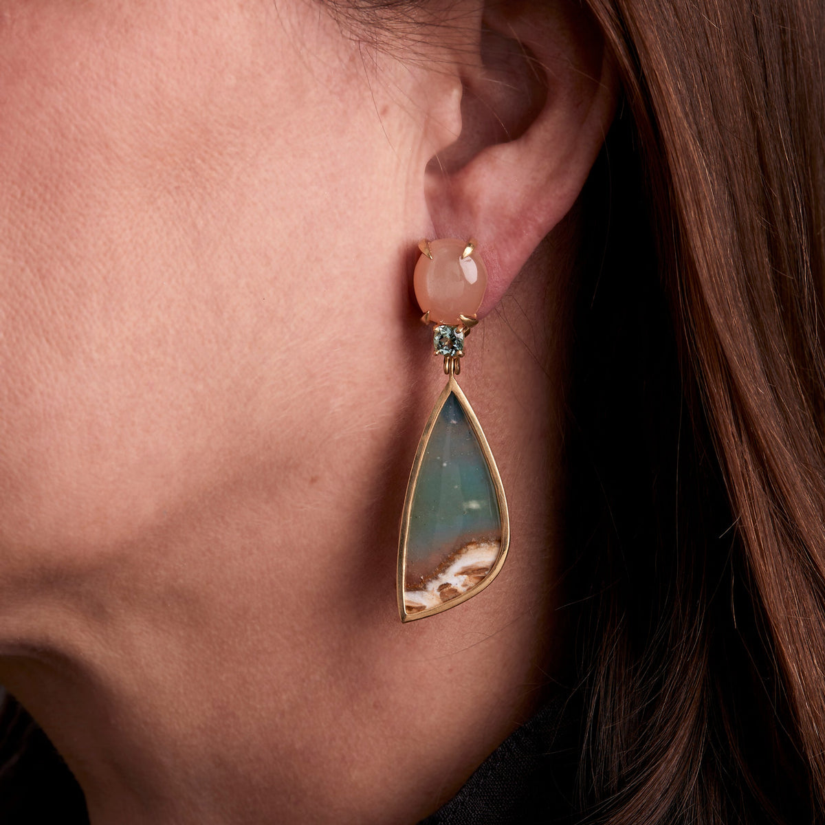 Peach moonstone, mint tourmaline, and petrified opalized wood set in 18k yellow gold. Measures 18 x 63mm. Post and omega clip back.