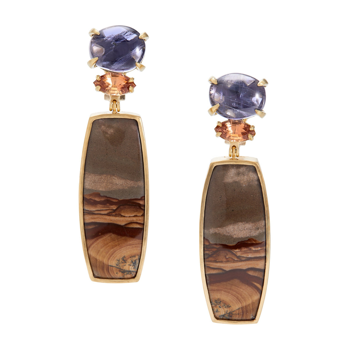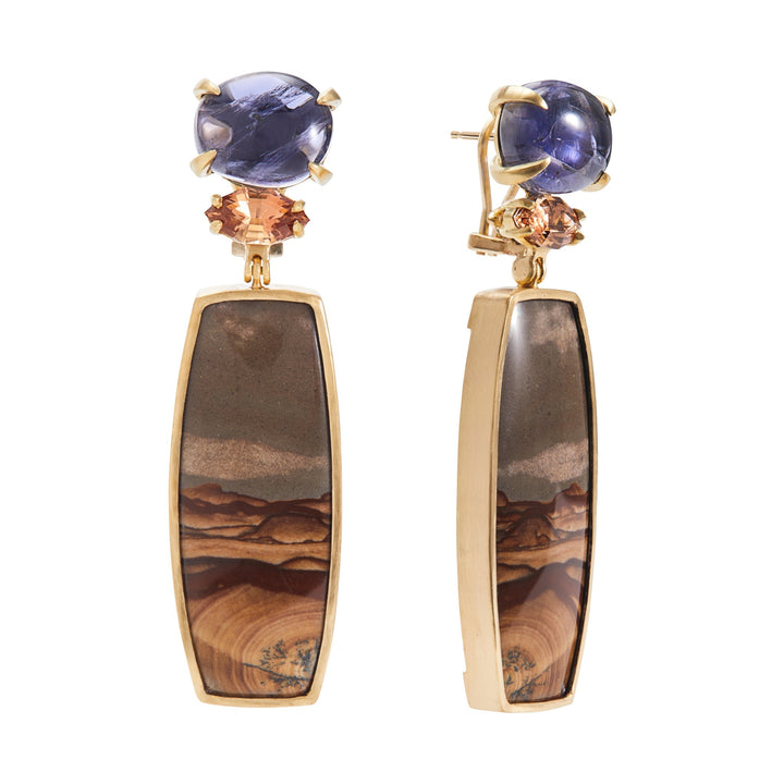 Iolite, topaz, and Deschutes jasper set in 18k yellow gold. Measures 18 x 63mm. Post and omega clip back.
