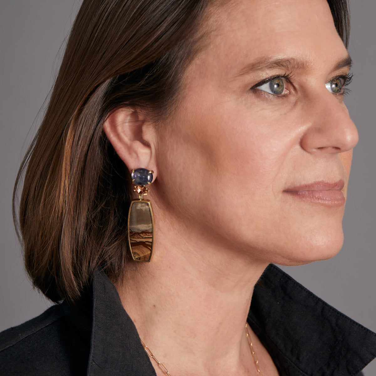 These Landscape: Mountain, Panorama Earrings by Daria de Koning stretch across vast mineral views, pairing cool iolite and shimmering topaz with Deschutes jasper’s layered terrain. The composition feels expansive and grounded—a true visual journey.