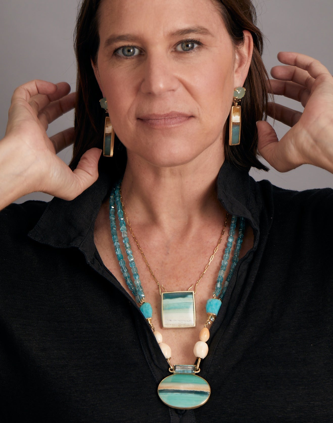 Style Notes: These Landscape: Ocean, Coastal Earrings by Daria de Koning shimmer with the clarity of sea and sun. Aquamarine and sunstone recall warm shallows, while the translucent blues of petrified opalized wood whisper of lost coral forests. A piece that invites calm and wonder.