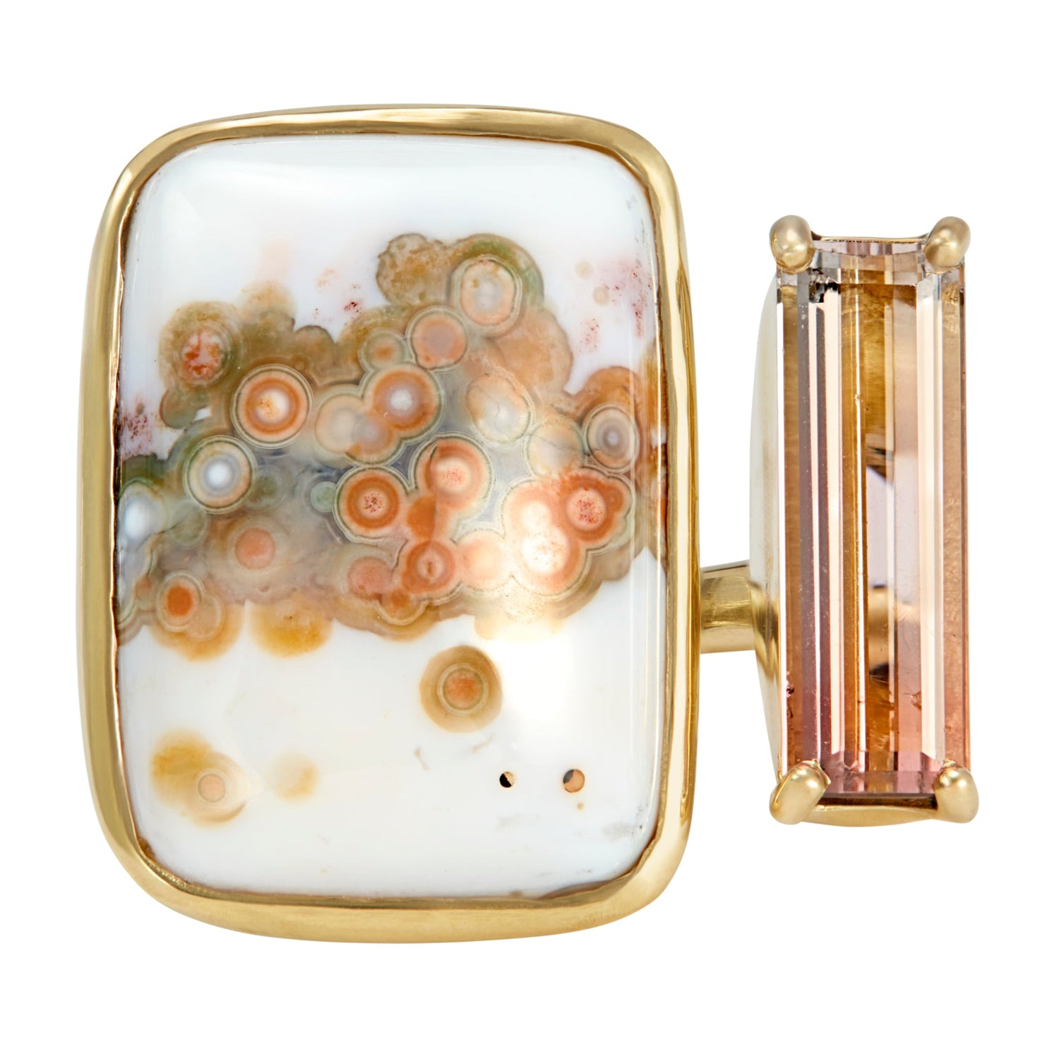 This Tandem Ring, Pink & Green Orbicular Jasper by Daria de Koning is joyful and bold. With a palette of blush, green, and bi-color pink-blue tourmaline, it feels playful and earthy—like a spring bloom rendered in stone.