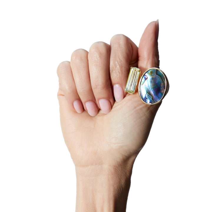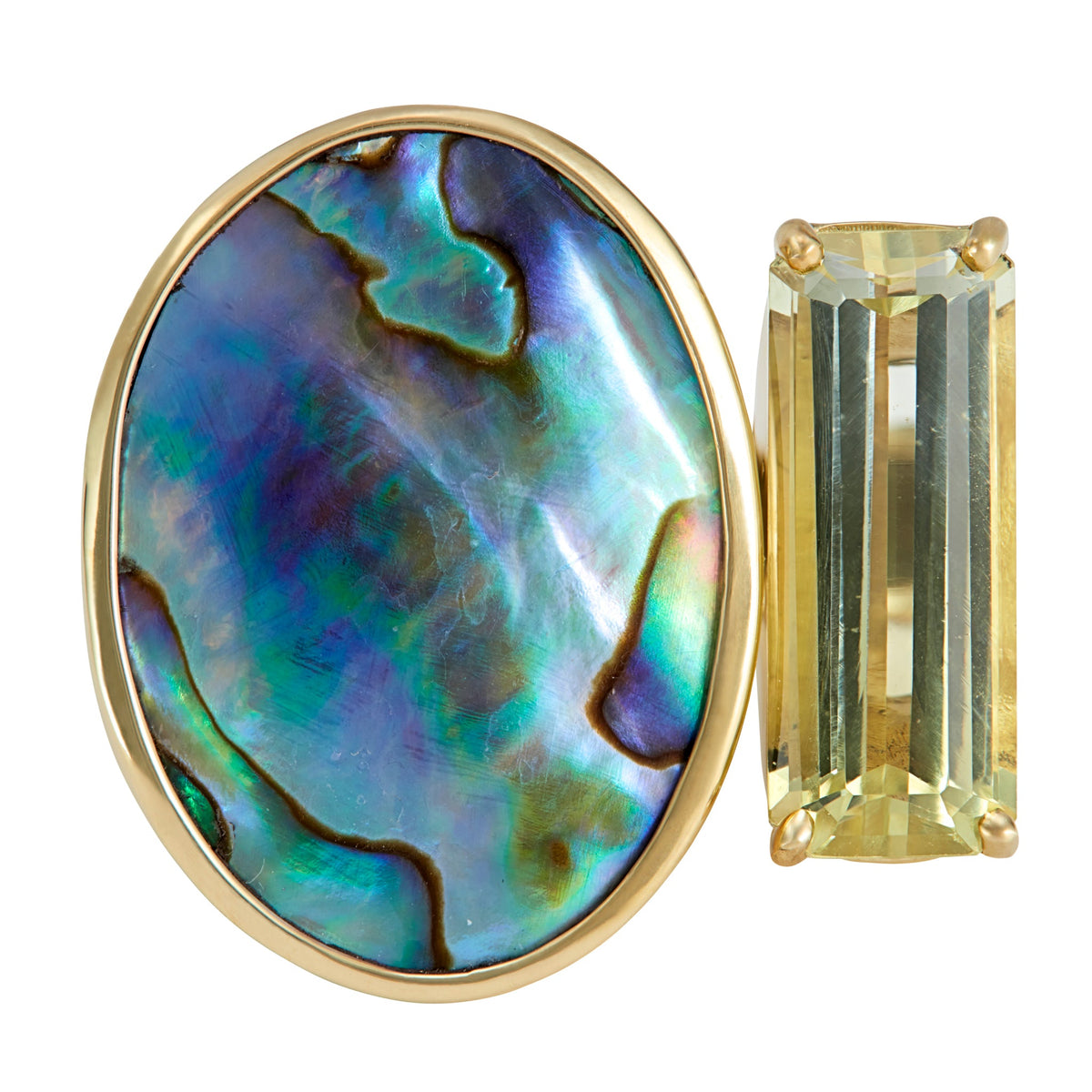 This Tandem Ring, Abalone by Daria de Koning captures the shimmer of tide pools and coastal treasure. A radiant abalone shell and golden beryl create an iridescent interplay of oceanic hues and warm light. Bold, organic, and endlessly luminous.