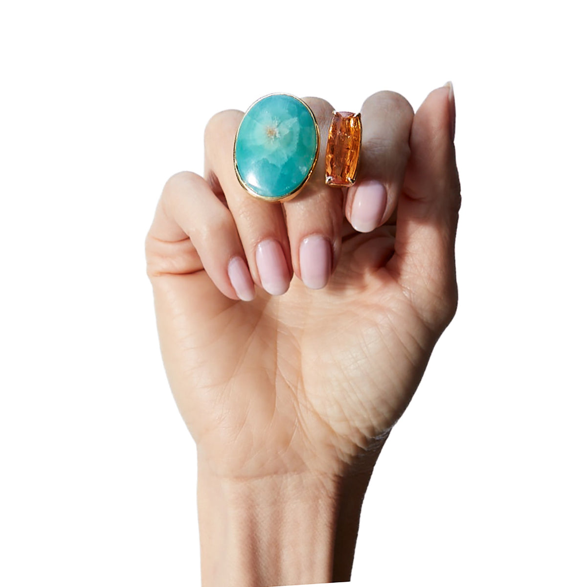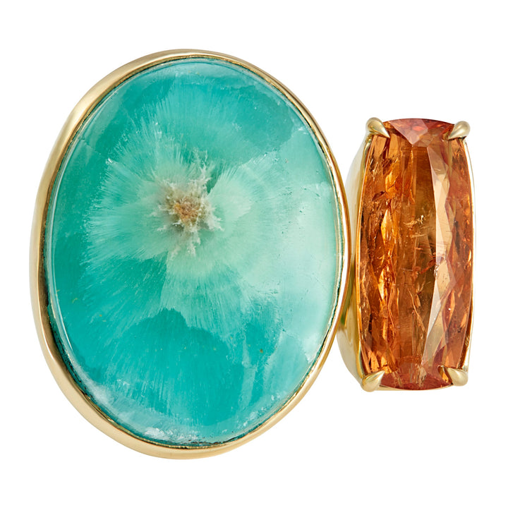 This Tandem Ring, Aragonite by Daria de Koning blends warm and earthy tones in a glowing composition. Aragonite’s organic texture meets the golden glint of imperial topaz, recalling desert minerals under blazing sun.