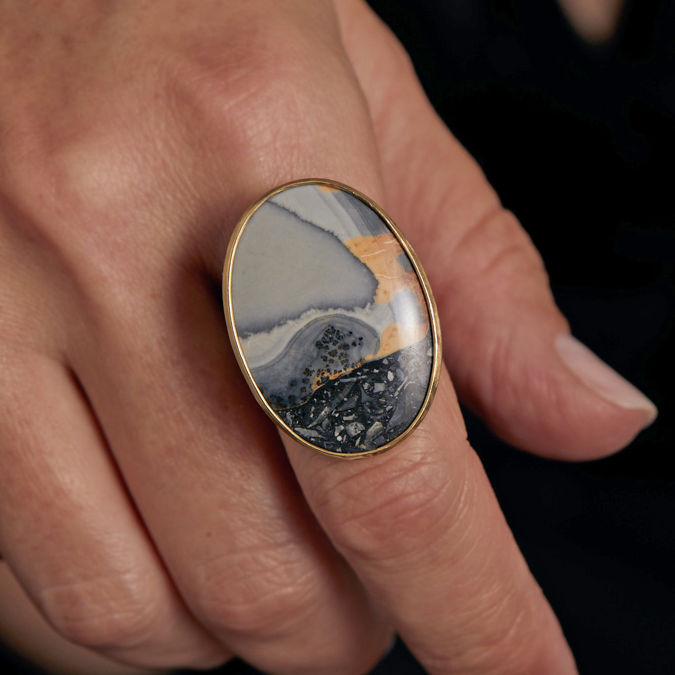 This Landscape: Sky, Squall Ring by Daria de Koning feels like a thunderhead over mountain ranges. Maligano Jasper swirls in tones of slate, orange, and blue—like a painted sky in motion. This rare material tells a story of earth’s fluid transformation.