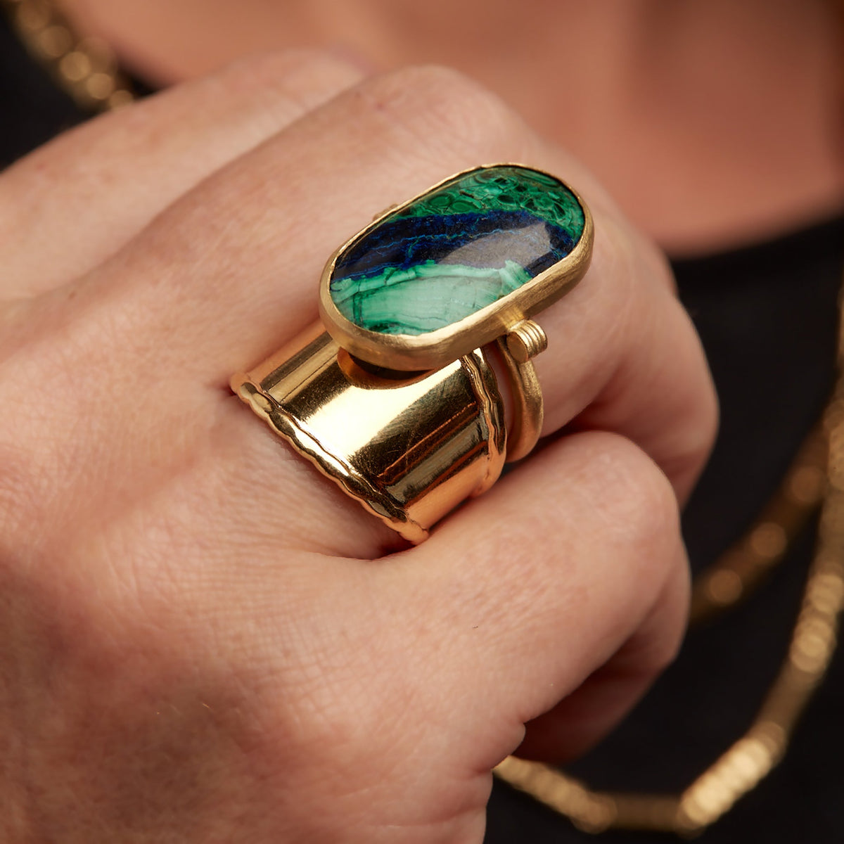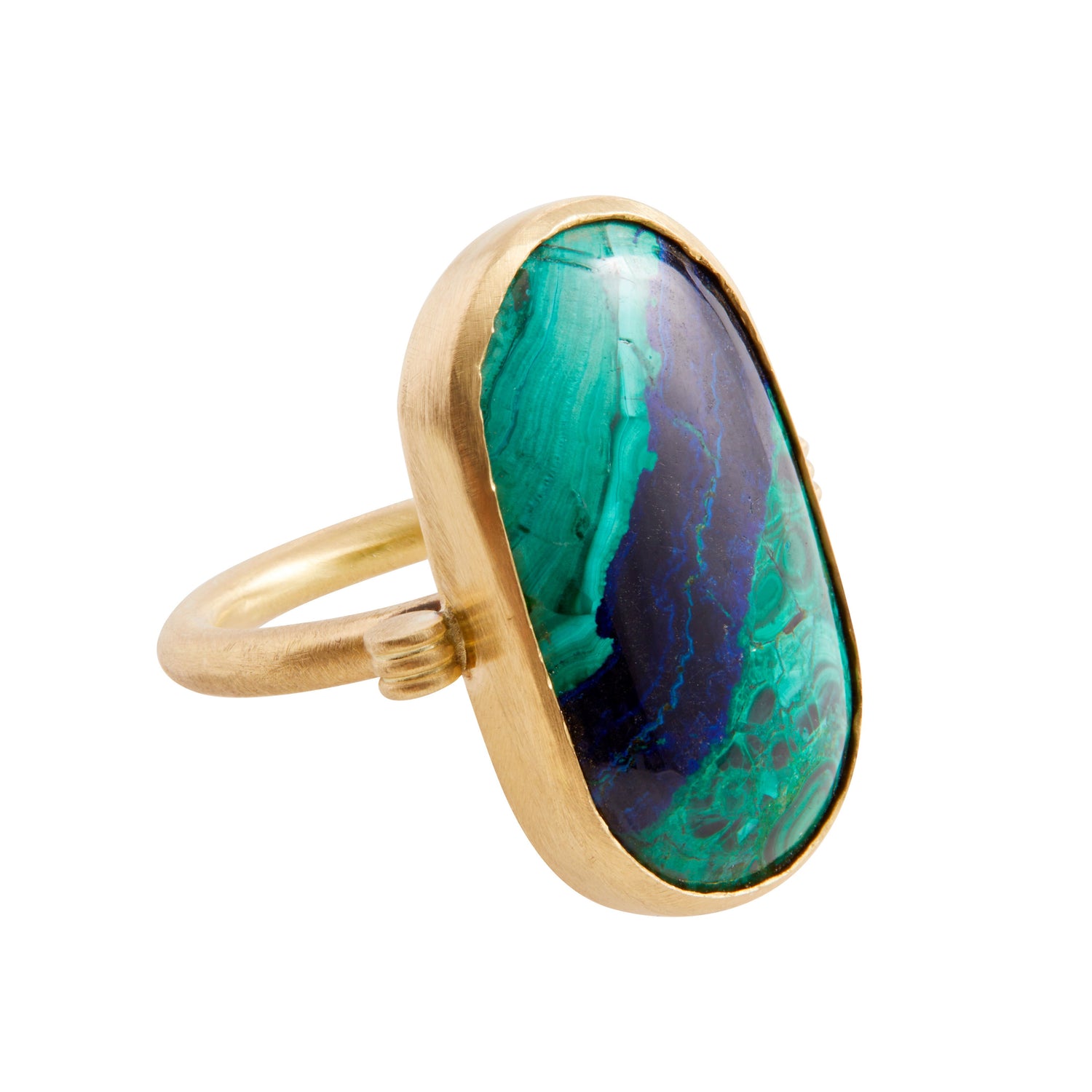 Azurite-malachite set in 18k yellow matte gold. Measures 15 x 25mm. Ring size 6.
