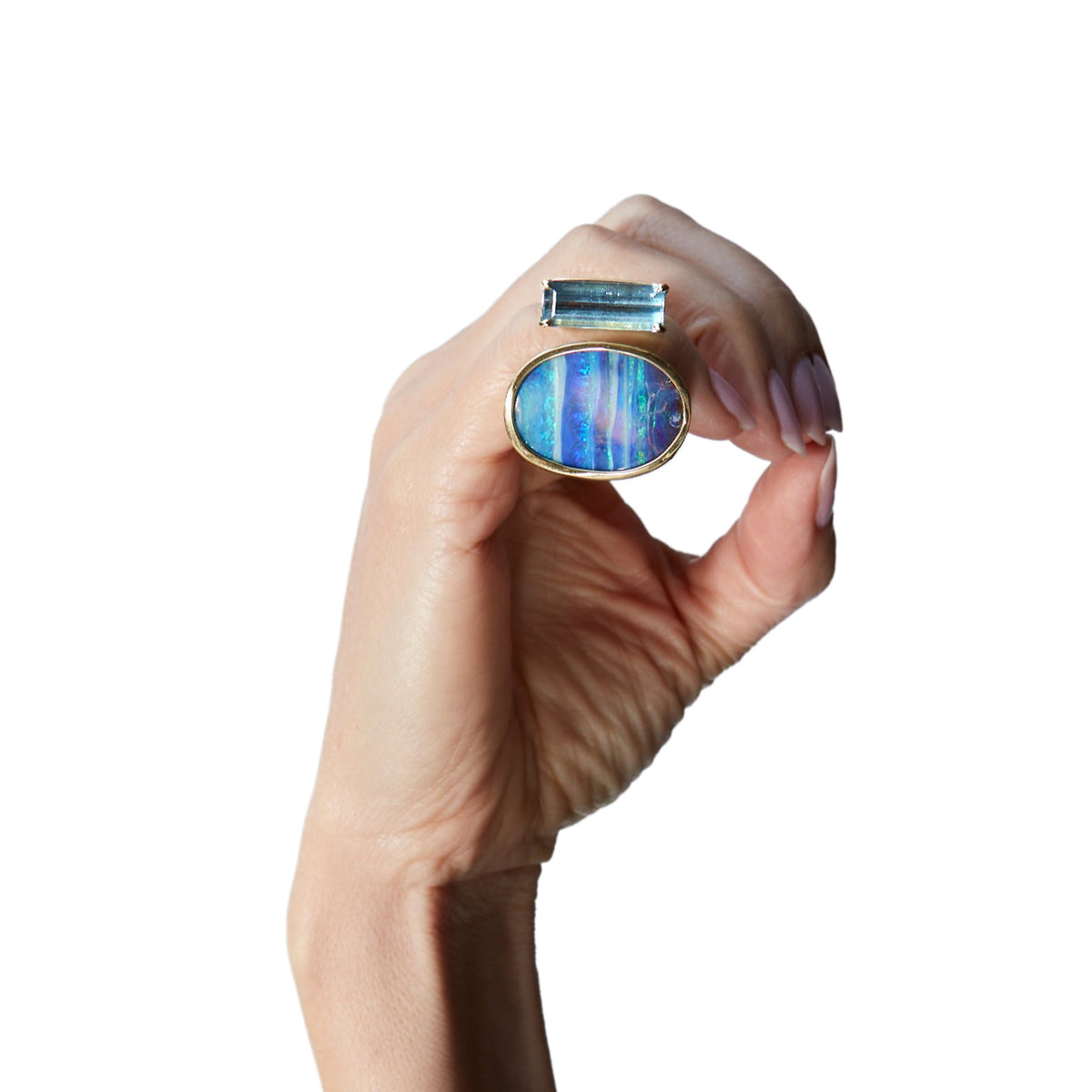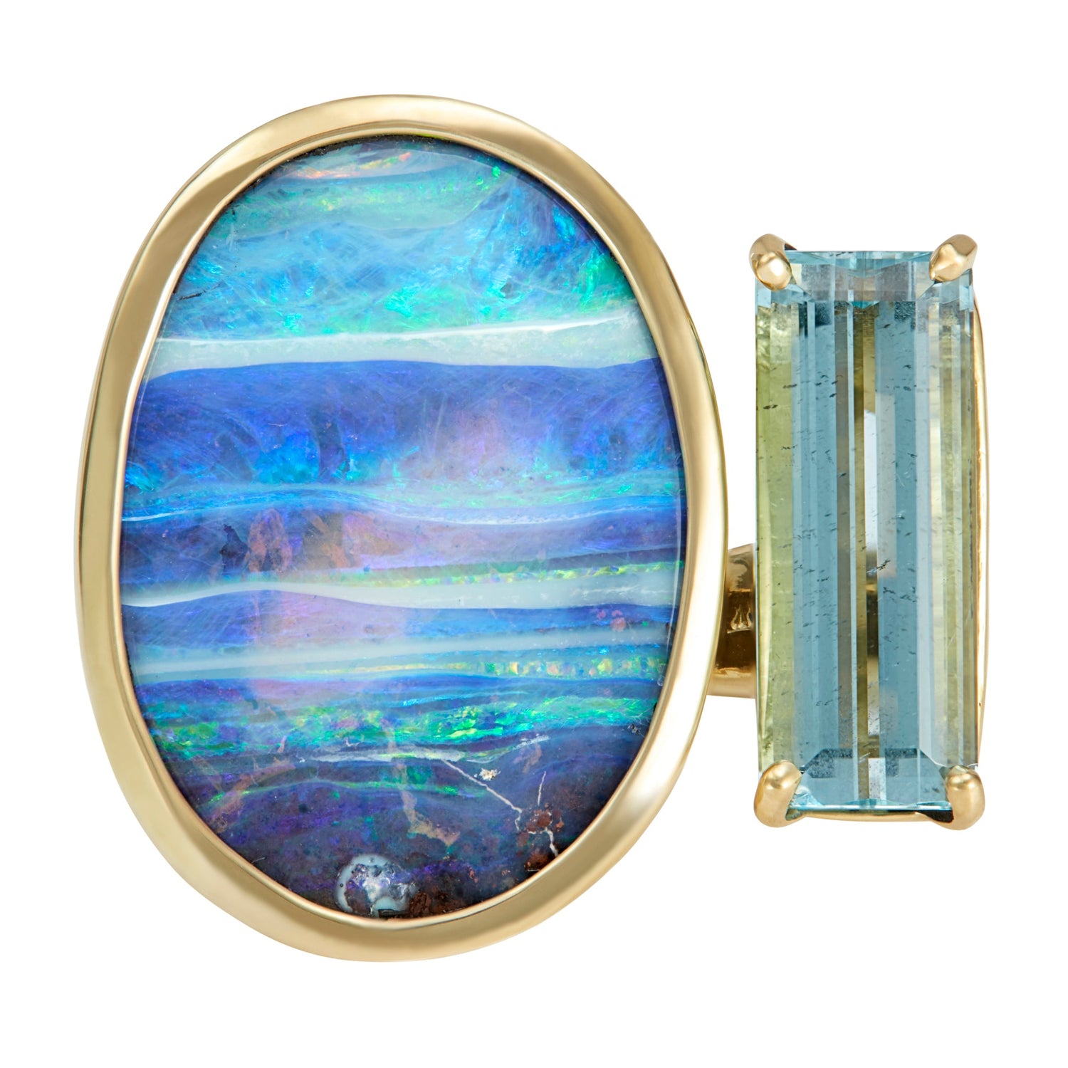 This Tandem Ring, Australian Opal by Daria de Koning shimmers with oceanic light. The electric flashes of boulder opal are enhanced by cool aquamarine, creating a luminous pairing inspired by the sea’s depths.