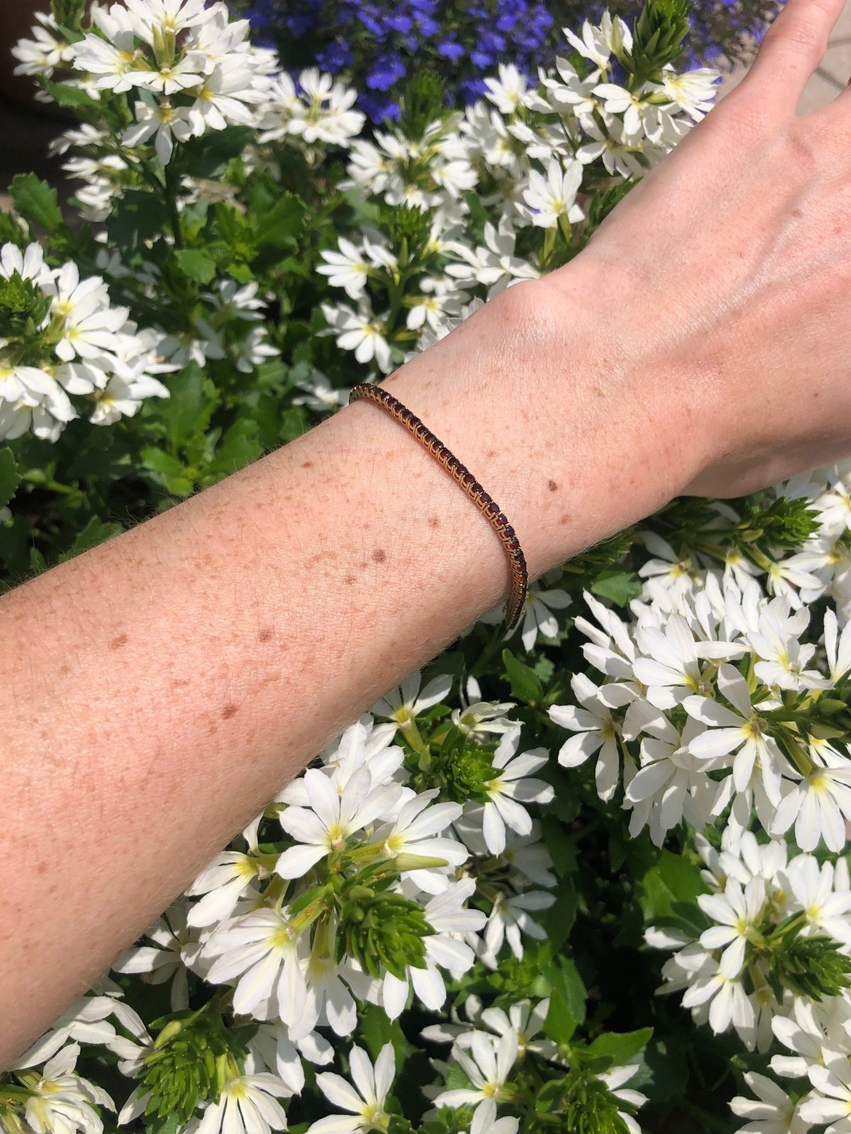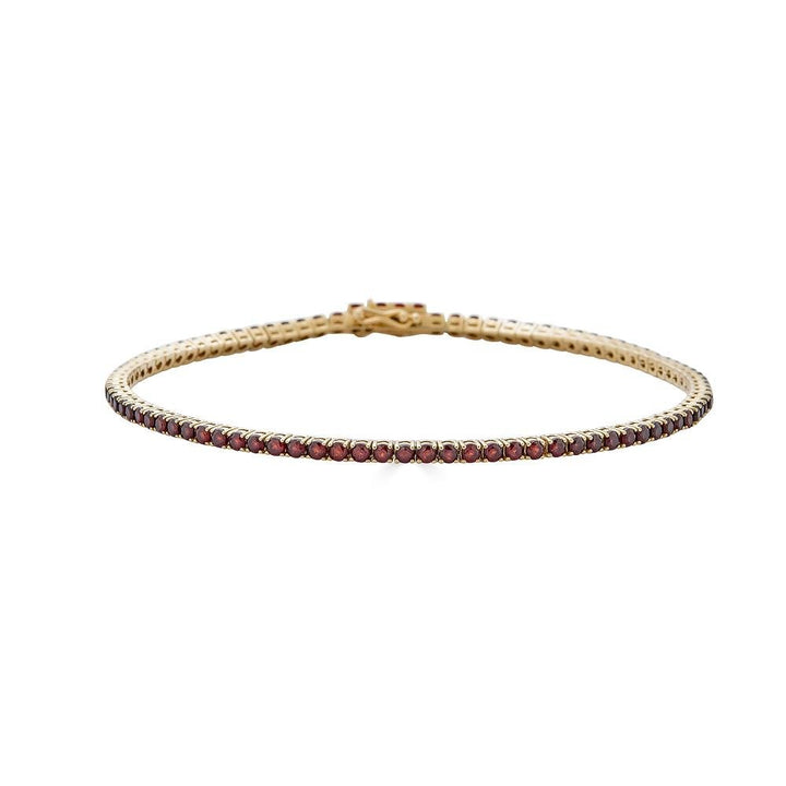 This Garnet Tennis Bracelet by Alexis Jae is a refined take on a jewelry classic. Each brilliant red garnet is set in its own four-prong setting, allowing light to highlight every natural facet. Designed in your choice of gold tone, this bracelet offers timeless elegance with personal flair—perfect for garnet lovers, January birthdays, or anyone seeking a bold yet feminine accent.
