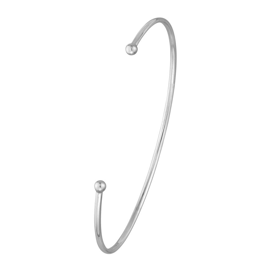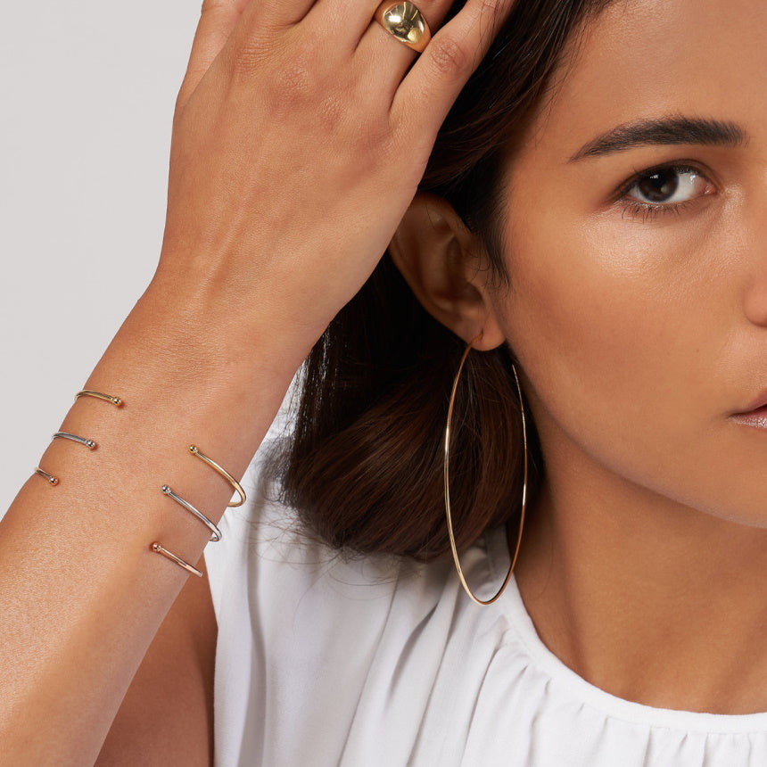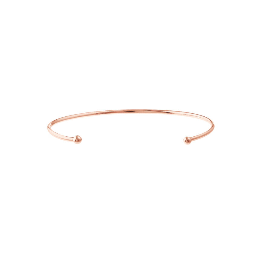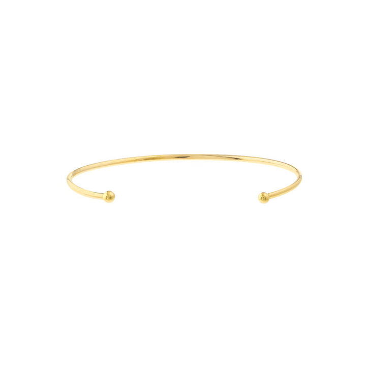 Cast in 14K gold (yellow, white, or rose) with 3mm ball ends. Open cuff style.