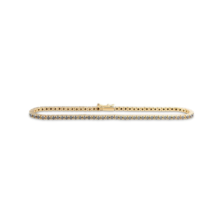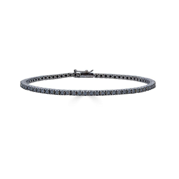 Made with round-cut black diamonds (~2.1 ctw for 7'), set in 14k white gold with black rhodium plating. Four-prong setting. Size: 6–7.5'. Figure eight double lock clasp.