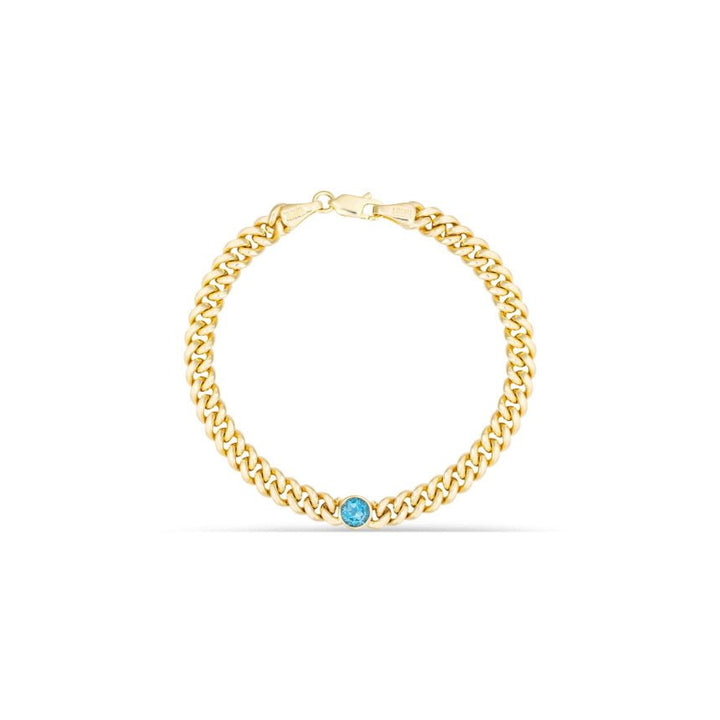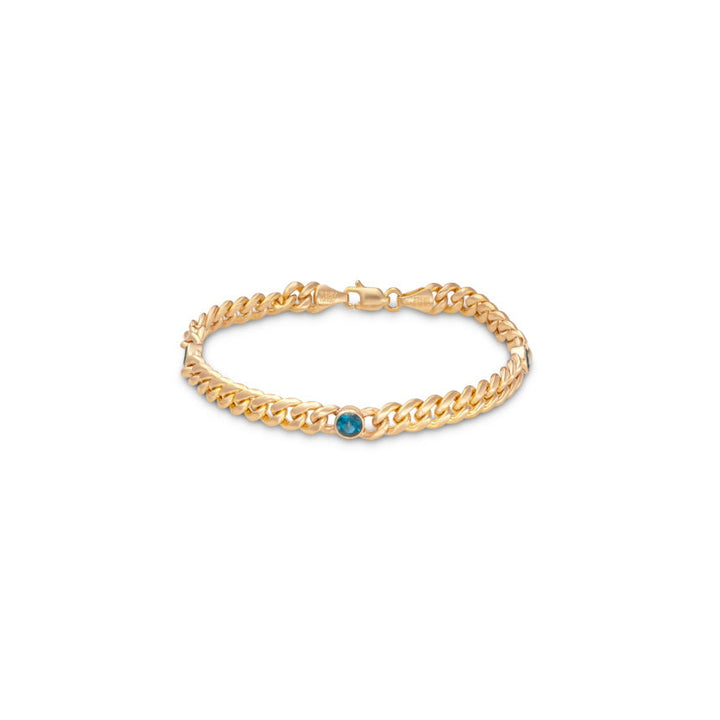This Blue Topaz Birthstone Bracelet by Alexis Jae is a bold yet refined celebration of December birthdays. A brilliant blue topaz is bezel-set into a gleaming Miami Cuban chain, making this bracelet a luxurious fusion of strength and sentiment. Wear it solo or stack it to add vibrancy to your wrist.