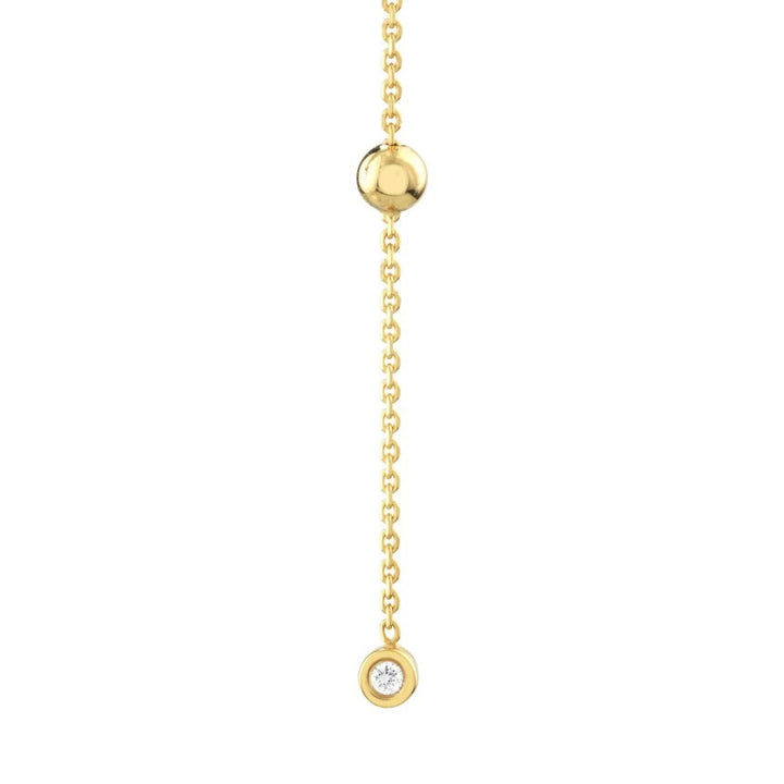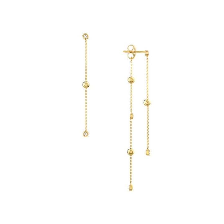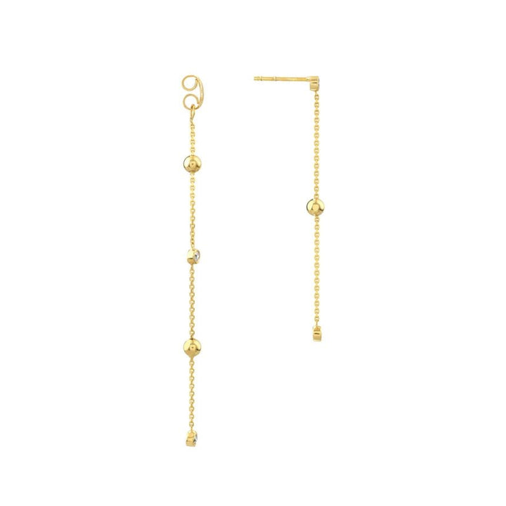 These Straight Dangle Earrings by Alexis Jae bring sleek elegance to any look. Featuring a vertical bead chain with bezel-set diamonds, they sway with every step, catching the light beautifully. Perfect for elevating your ensemble with grace and subtle sparkle.