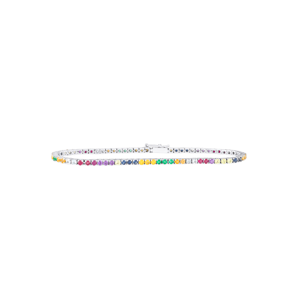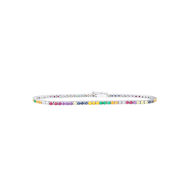 This Rainbow Gemstone Tennis Bracelet by Alexis Jae adds a vibrant twist to a classic silhouette. Lush, round sapphires in a prismatic array create a colorful flow of brilliance, perfect for making any outfit pop. This bracelet is an eye-catching ode to bold elegance.
