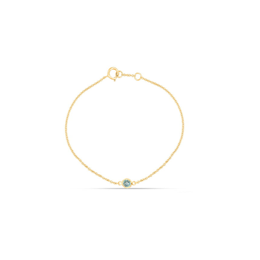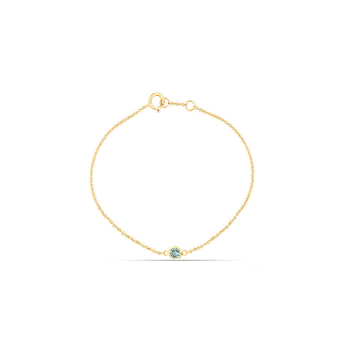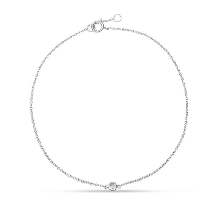 Crafted in 14K solid gold (yellow, white, or rose) with a round aquamarine totaling 0.09 carats. Cable chain: 7' with adjustable loop at 6.5'.