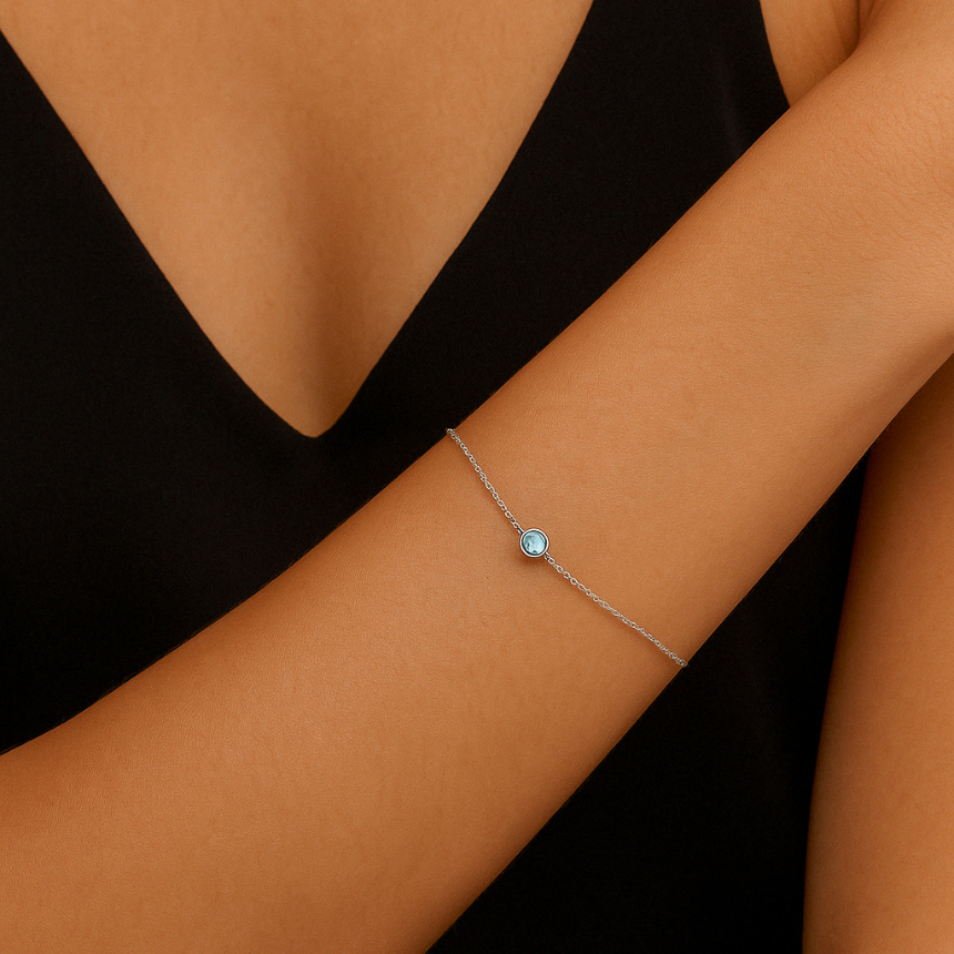 This Real Aquamarine Bracelet by Alexis Jae is a delicate expression of tranquility and elegance. A serene aquamarine—March’s birthstone—is set on a fine cable chain, offering just the right hint of soft color. Its airy simplicity makes it ideal for everyday wear or meaningful gifting. Whether honoring a birthday or indulging in a calming touch of blue, this bracelet brings light and grace to any wrist.