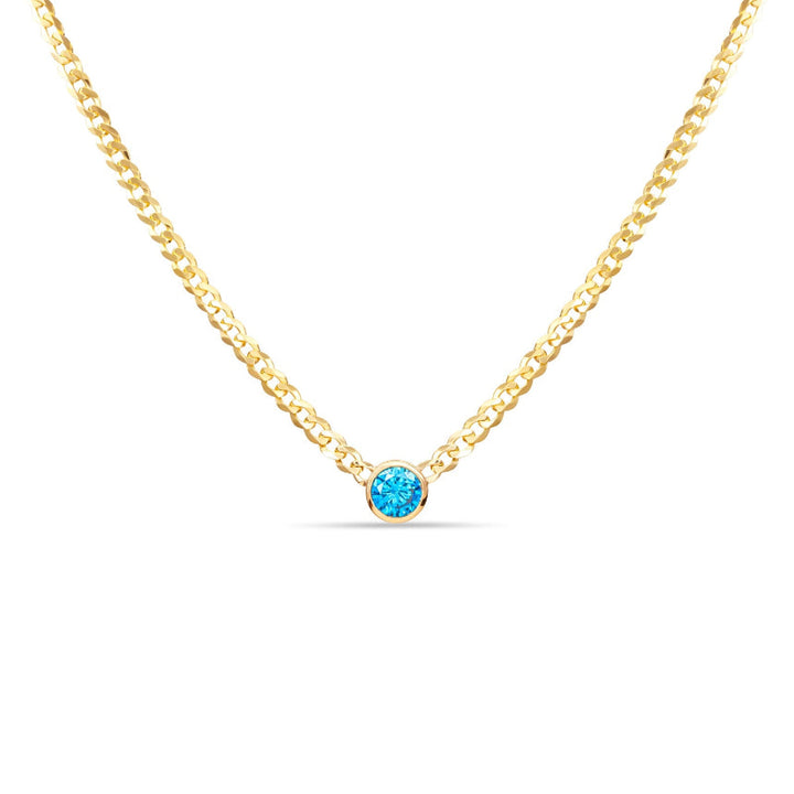 Made in 14K yellow gold with a 3.7mm curb chain. Features one bezel-set birthstone of choice. 16” length.