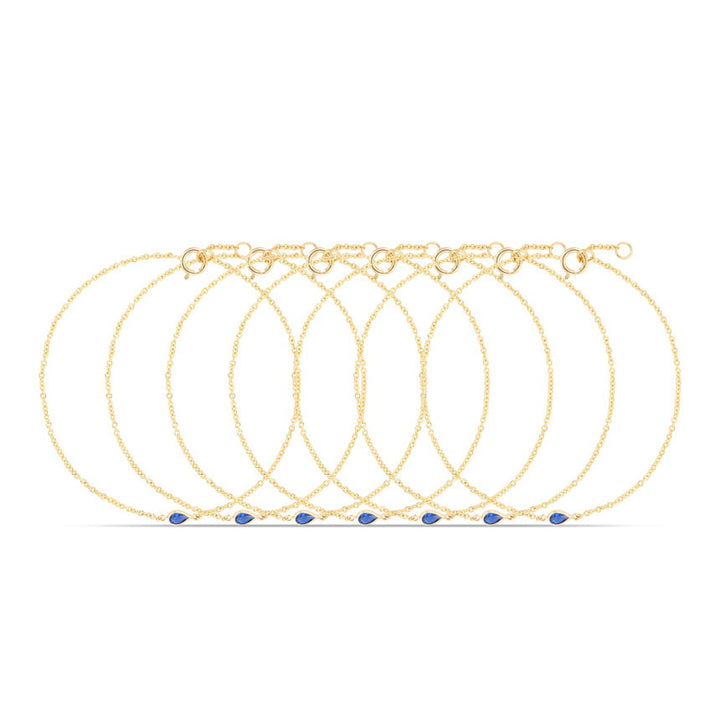 Handcrafted in 14k solid gold (yellow, white, or rose), featuring a 0.09 cttw natural blue sapphire in your choice of round, baguette, or pear shape. 7” cable chain with adjustable jump ring at 6.5”.