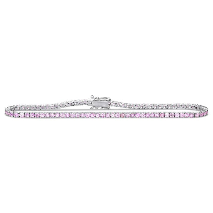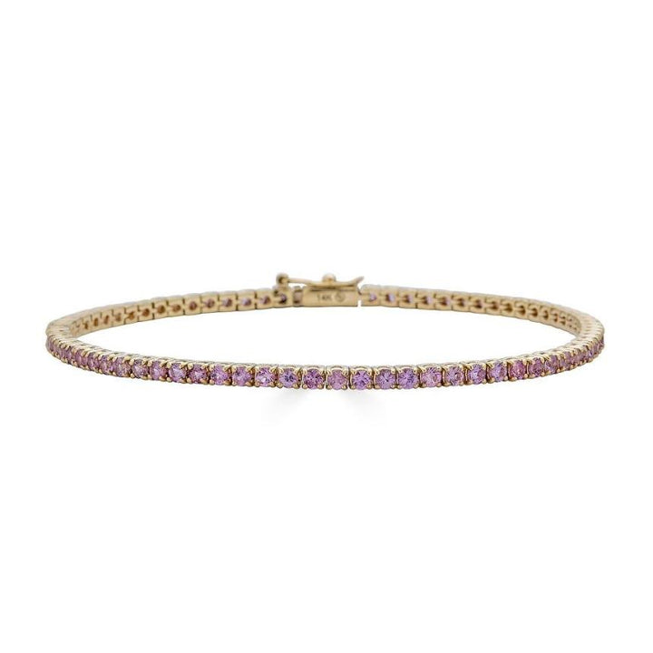 Handcrafted in 14k solid gold (yellow, white, or rose), featuring round pink sapphires (~0.04 cttw per stone, ~2.2 cttw total for 6.5” length). 1.85–1.95mm stones in individual four-prong settings. Available in lengths from 6–7.5”.