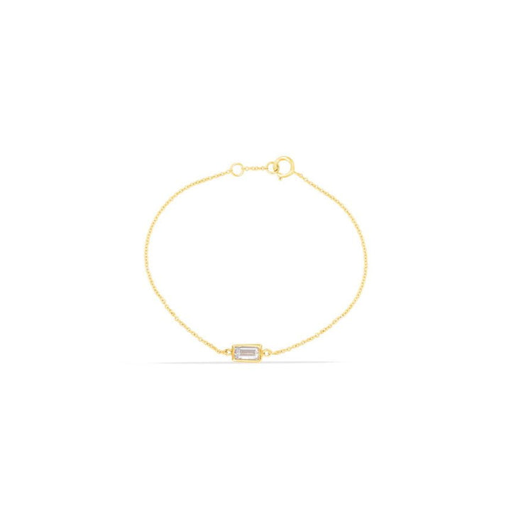 This Single Stone Diamond Bracelet by Alexis Jae captures the elegance of minimalist design with a quiet sparkle that speaks volumes. The baguette diamond sits delicately in a modern eyeglass setting, offering a chic and contemporary silhouette that complements every look. Understated yet captivating, this bracelet was made for effortless layering or to wear as a subtle daily signature. Its sleek design celebrates simplicity while placing all the emphasis on the luminous .10 ct diamond. Ideal for those who embrace classic beauty with a refined twist, this bracelet adds timeless charm to any jewelry collection.