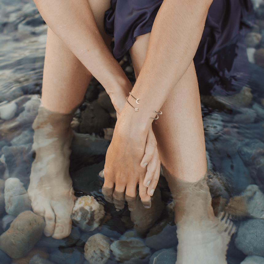 This Crescent Moon Bangle by Alexis Jae offers celestial sophistication with a wire cuff silhouette and diamond-studded crescent moon motif. A symbolic tribute to new beginnings, growth, and feminine energy, this bracelet radiates quiet strength and grace. Designed as part of the brand’s Celestial Collection, it layers beautifully with other bracelets but stands confidently on its own. Dainty yet bold, this bangle adds a touch of mysticism and timeless glamor to any ensemble.