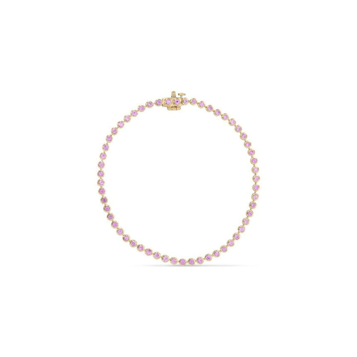 Made in 14K solid gold (yellow, white, or rose), featuring approximately 2.7 carats of round-cut natural pink sapphires. Bezel set. Length: 6–7.5'.