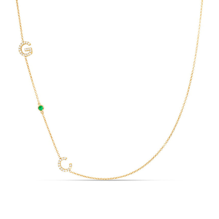 Made in 14K solid gold (yellow, white, or rose), set with ~.08 carats of diamonds per initial and .12 cttw total. Initials measure 7mm. Chain length: 18' with a jump ring at 16'. Available birthstones include amethyst, aquamarine, blue sapphire, diamond, emerald, garnet, ruby, and blue topaz.
