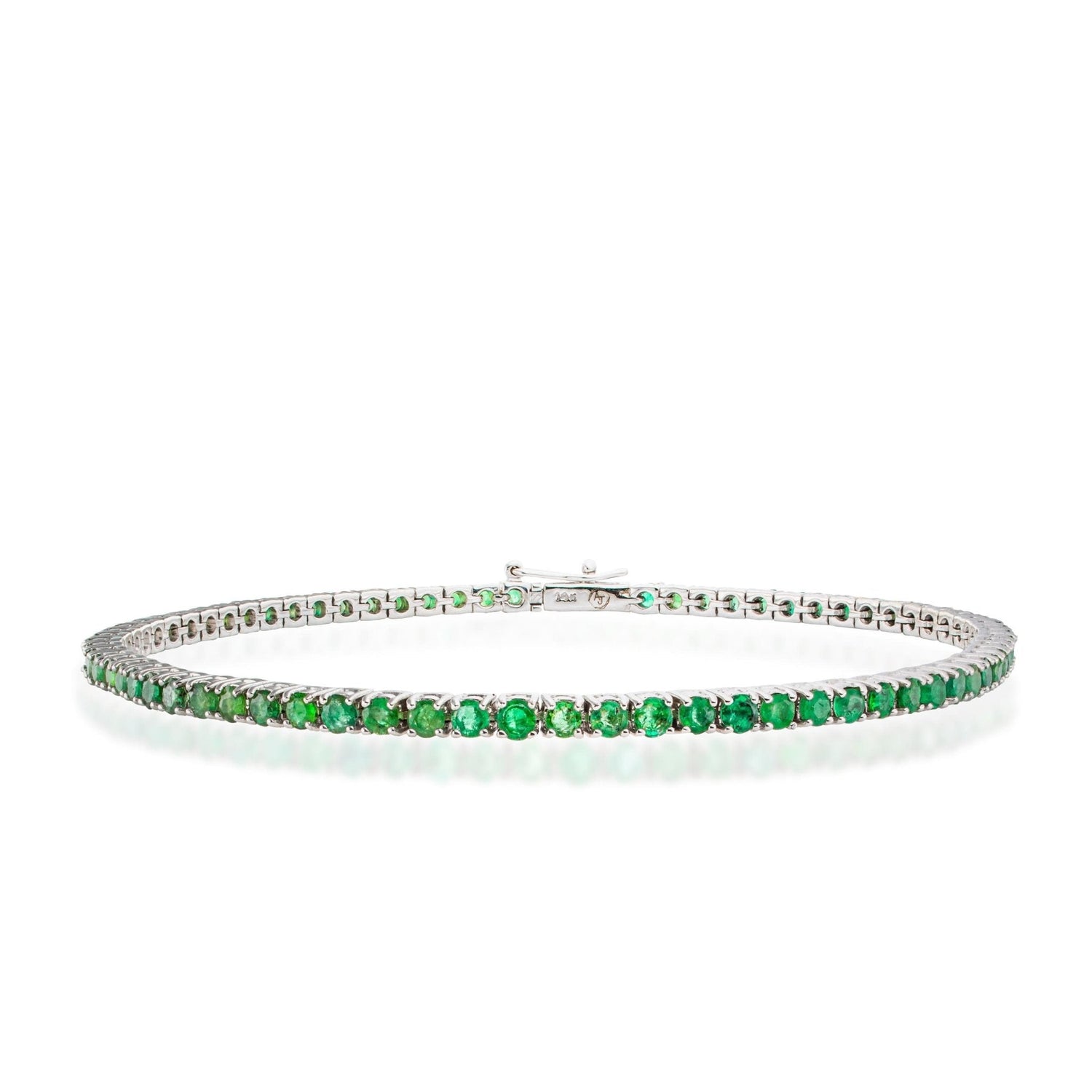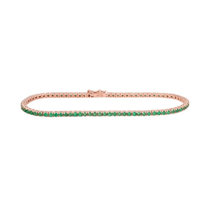 Features natural round emeralds (1.85–1.95mm) totaling ~2.35 carats (based on 7' length). Four-prong setting in 14K solid gold (yellow, white, or rose). Available in sizes from 6' to 7.5'. Ethically sourced emeralds from India.