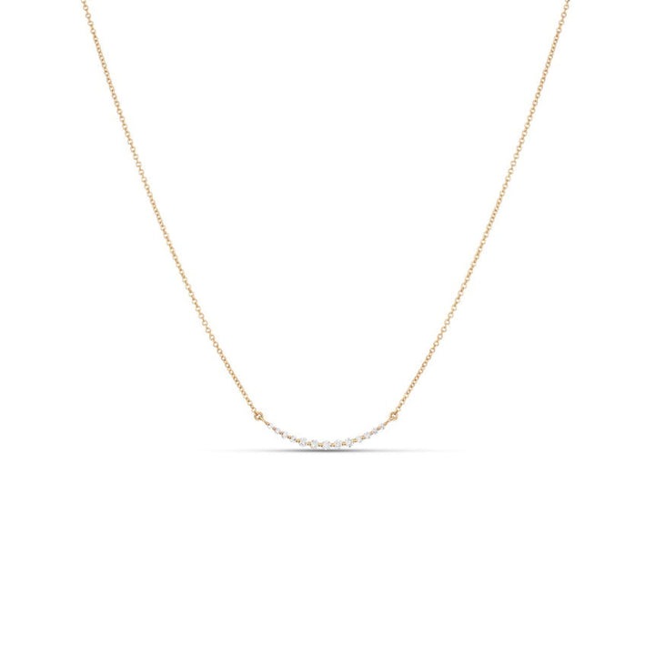 This Floating Bar Necklace by Alexis Jae blends modern minimalism with radiant sparkle. Featuring a gently curved gold bar adorned with graduated brilliant-cut diamonds, it creates a graceful silhouette that seems to float along your neckline. Whether layered or worn solo, this necklace delivers refined sophistication with a contemporary edge—ideal for both daywear and evening elegance.