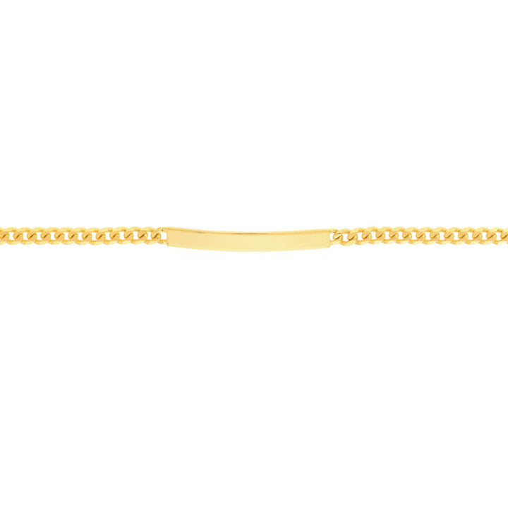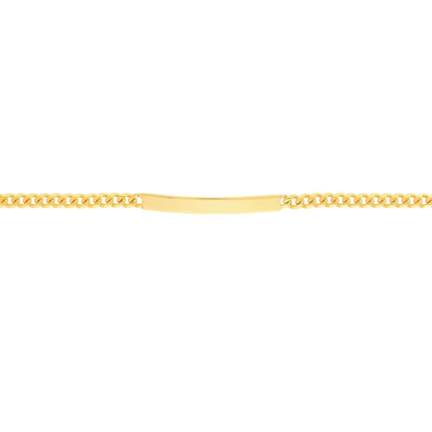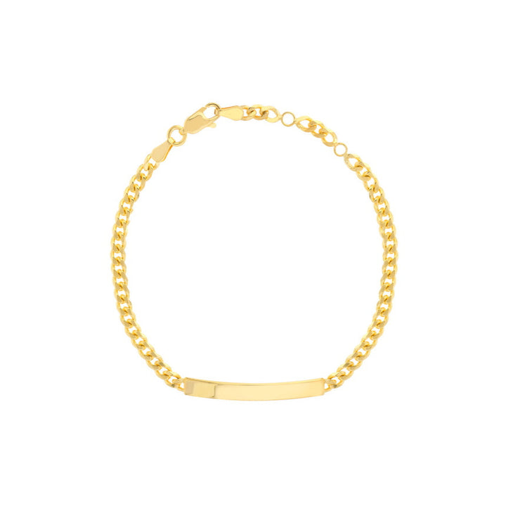 Made in 14K yellow gold with a 3.4mm curb chain. Chain length: 7.25”. Lobster clasp. Custom engraving available.